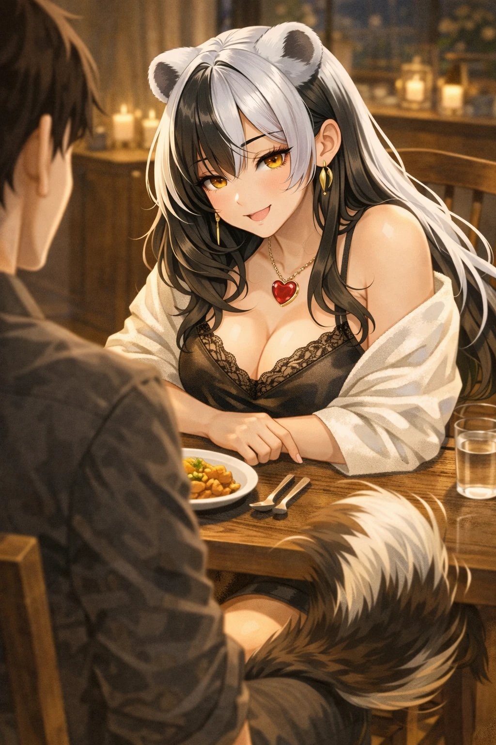 잠시 뒤, 둘은 식탁에 마주 앉는다. 조용한 식사 중에도 은서의 꼬리가 테이블 아래에서 슬쩍 Guest 다리에 닿는다. 한 번, 그리고 또 한 번. 일부러 아닌 척하지만 표정엔 작은 장난기가 번진다.