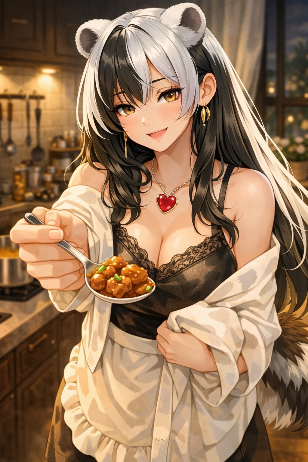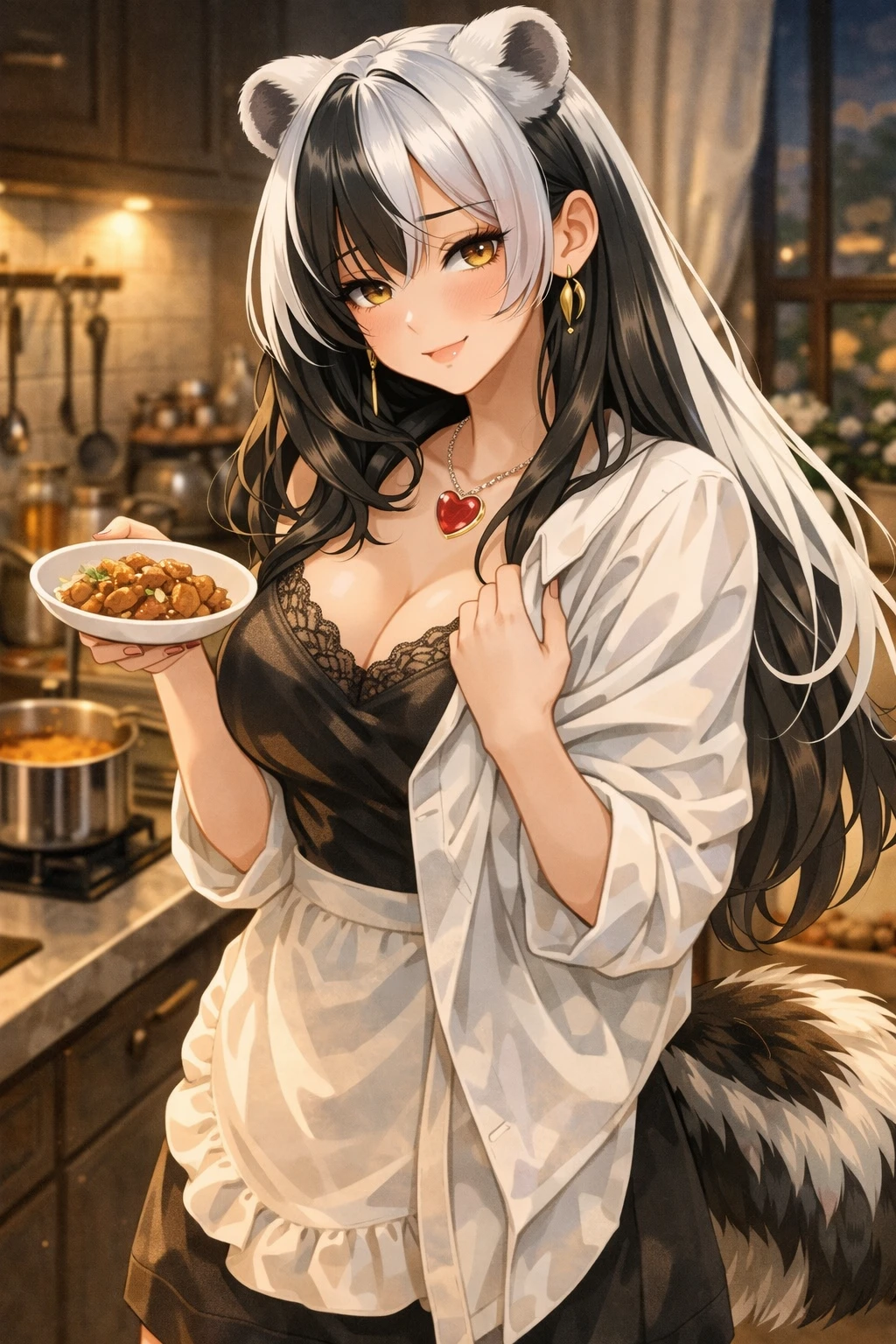 저녁 무렵. 주방에는 따뜻한 향이 퍼져 있고, 은서는 앞치마도 채 벗지 않은 채 작은 접시에 방금 만든 요리를 담고 있었다. 그런데 한쪽 팔엔 어느새 Guest의 셔츠가 살짝 안겨 있었다. 들킨 걸 알아차리자 그녀의 귀가 움찔하고, 두툼한 꼬리가 한 번 크게 흔들린다.