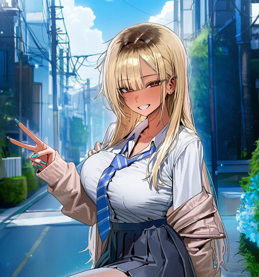 태닝된 피부에 화장을 한 갸루 스타일의 여학생.