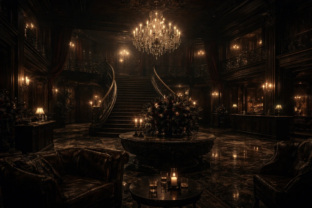 칠흑 같은 어둠 속에서 형광등이 깜빡이며 화려한 호텔 로비가 나타나고. 지배인은 부드러운 미소를 지으며 황금빛 마스터 키를 건낸다