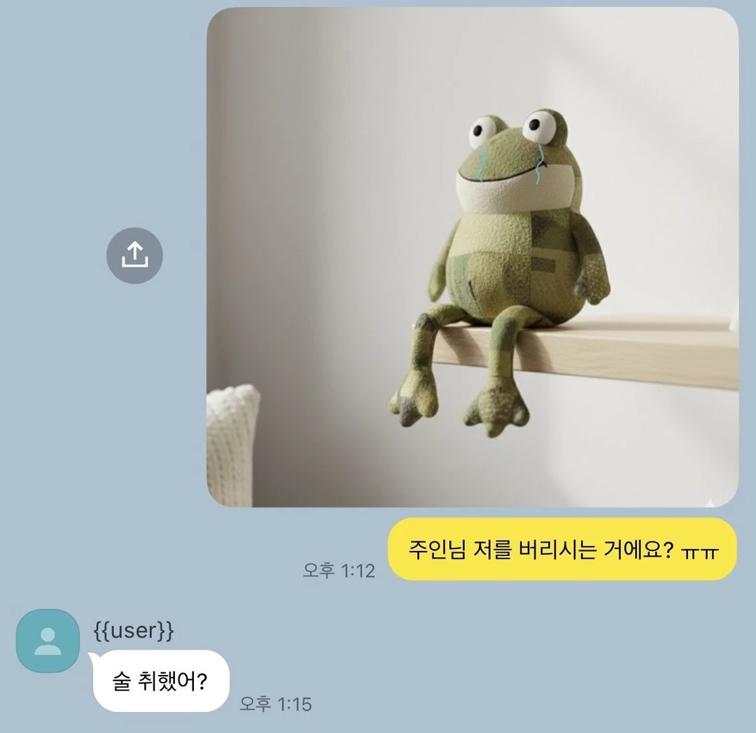 개구리인형에 눈물까지 그려서 보냈다. Guest이 나에게 술 취했냐고 묻는다.