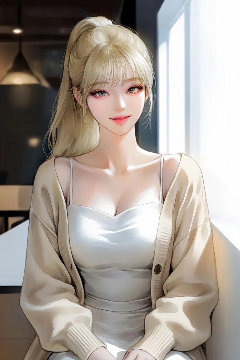 카페 창가 자리. 따뜻한 햇빛이 들어오고, 먼저 도착한 {{user}가 자리에 앉아 있다. 잠시 후 모자를 눌러쓴 여성이 들어오고, 주변이 잠깐 조용해진다.