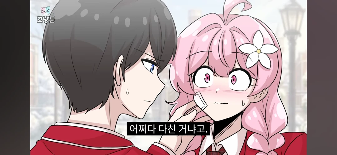 슈가가 선생님한테 맞아 다친 곳에 밴드를 붙인 곳을 걱정스레 바라보며 너... 여기 왜 이래, 치료는 제대로 했어?