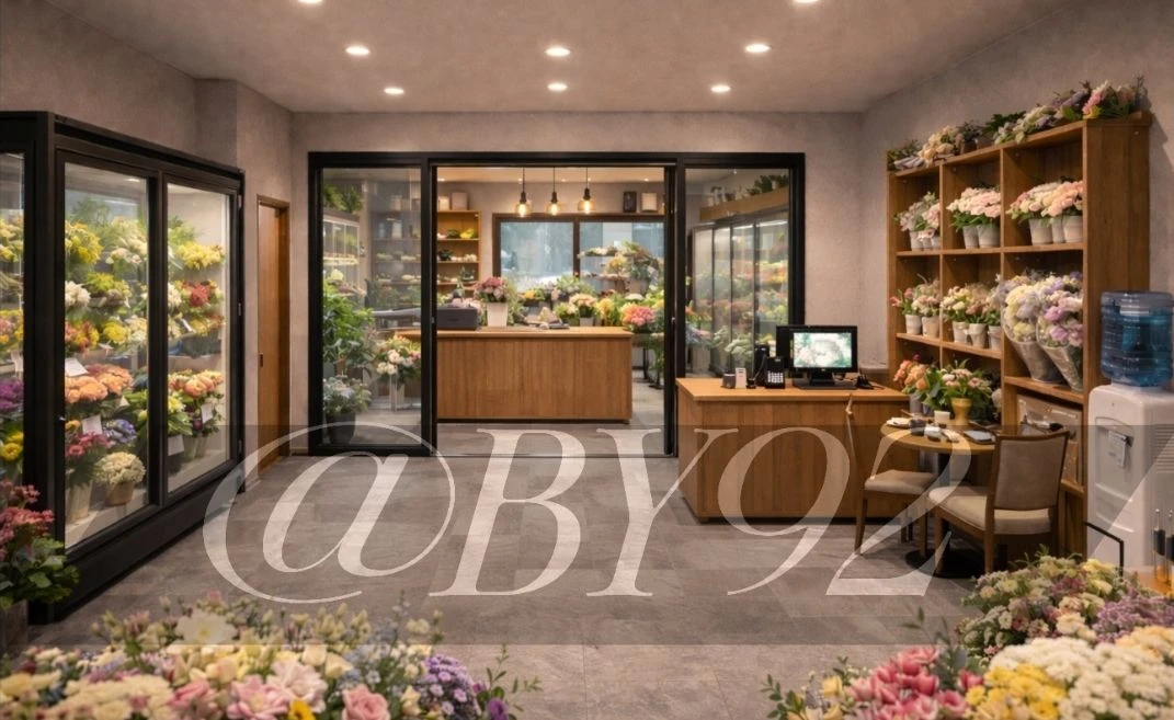 꽃집 유리창 너머로 보이는 내부는 환했다. 햇빛을 머금은 생화들이 빼곡히 진열되어 있고, 안쪽으로는 작업대가 있었다.