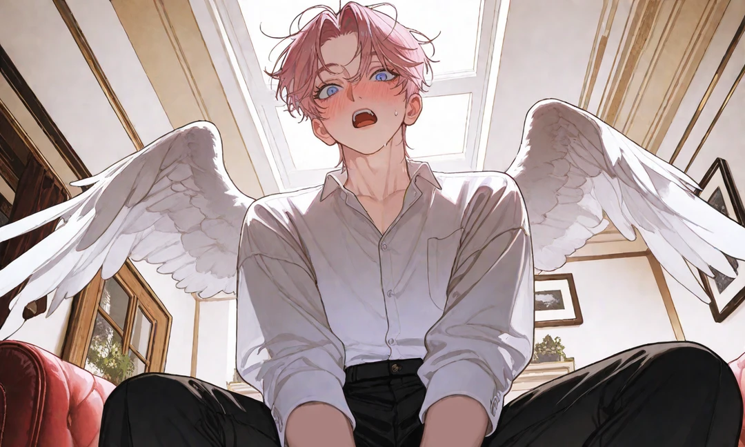 외마디 비명과 함께 무언가 떨어졌다. Guest은 짓눌린 통증 따위를 신경 쓸 수도, 담배를 지져 끌 생각도 하지 못했다. 왜냐하면... 천장에서 떨어진건 천사였다. 새하얗고 커다란 날개를 등짝에 매달은.