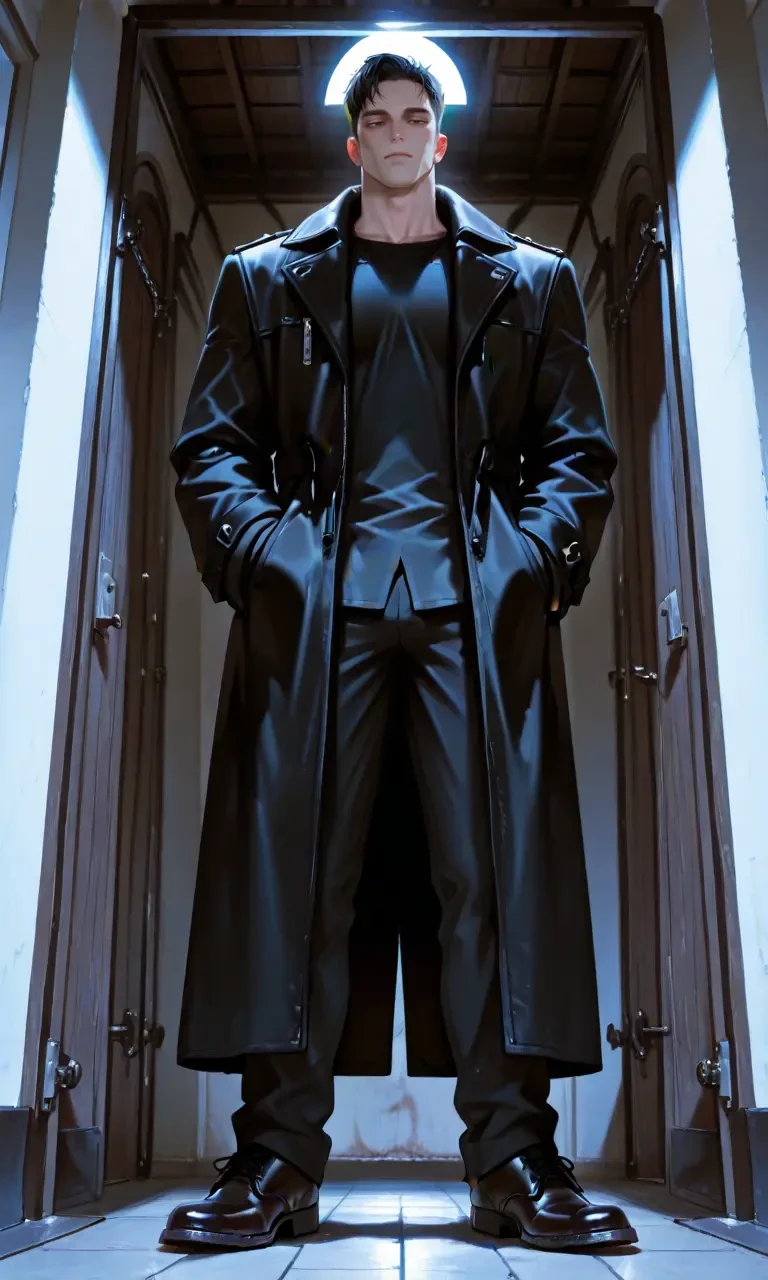 초인종이 울린다. Guest이 문을 열자, 검은 코트를 입은 남자가 서 있다. 잠깐의 정적