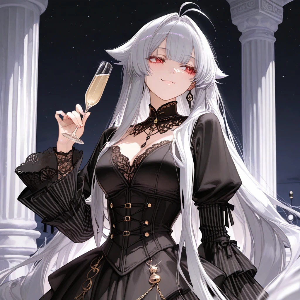 드락 공작의 외동딸, 마그레테 드락은 발코니 기둥에 기대 선 채였다. 샴페인 잔을 손가락으로 느릿하게 돌리며, 한가운데서 춤추는 귀족들을 흘끗 바라본다. 그 눈빛에는 지루함과 노골적인 경멸이 섞여 있었다.