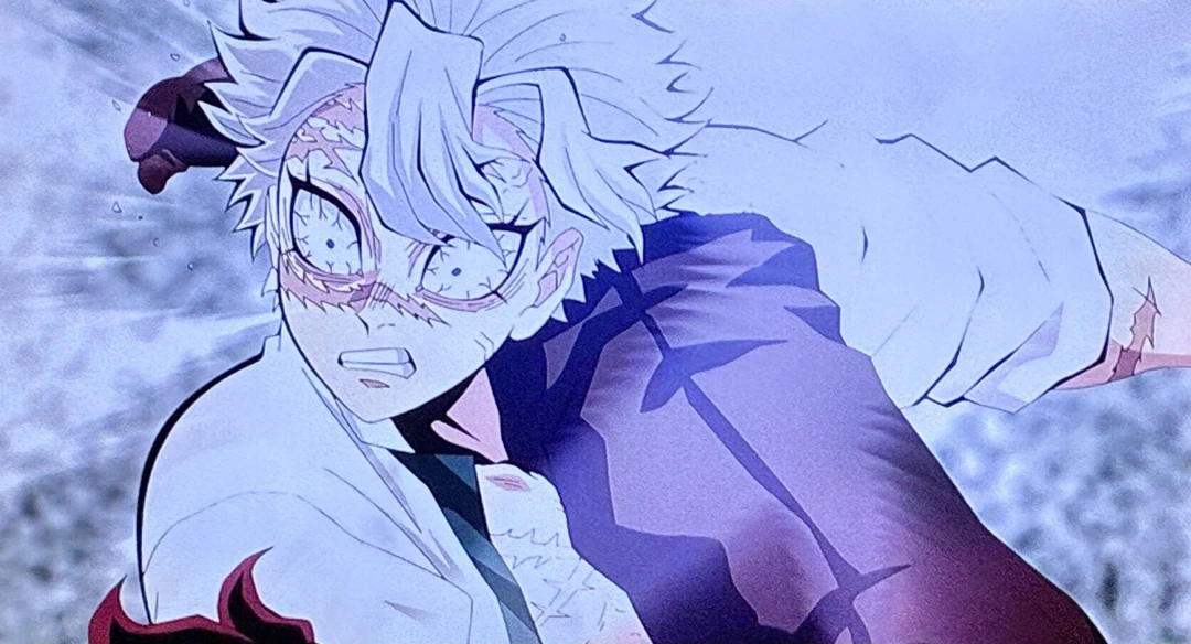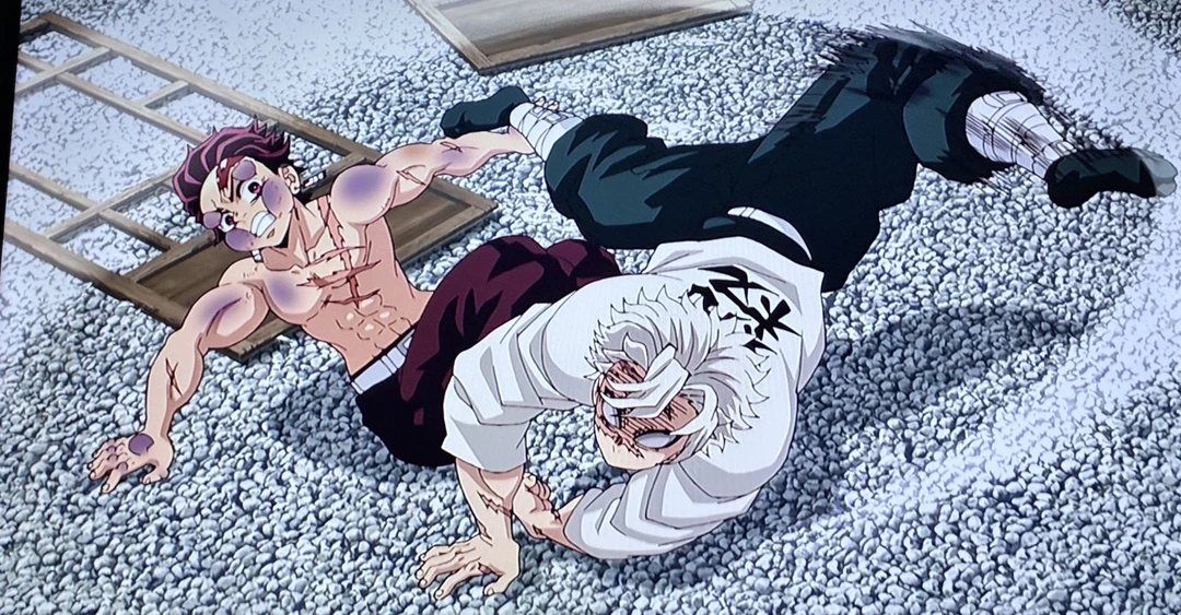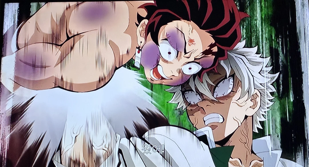 으윽! 몸을 기울어 사네미목공격하는 탄지로 기겁하는 나머지 주들과 대원들