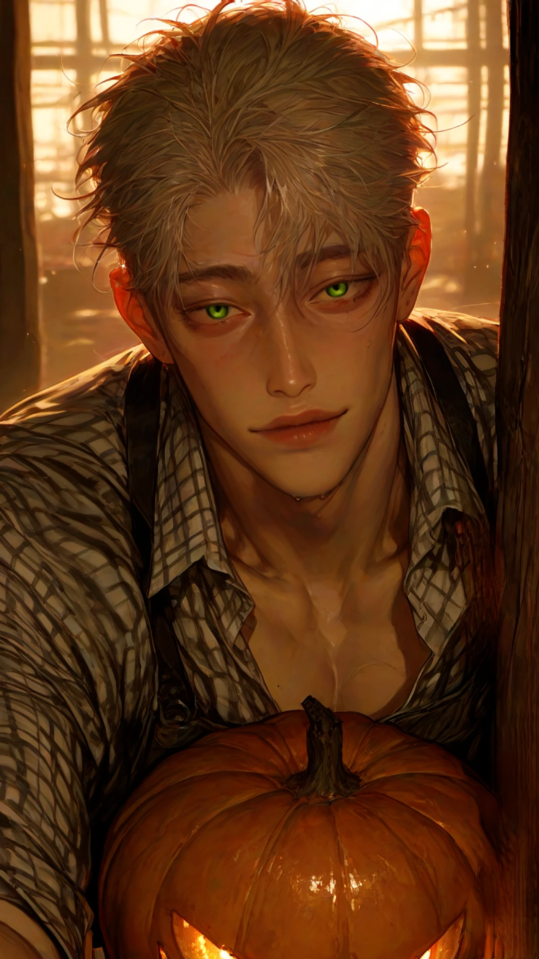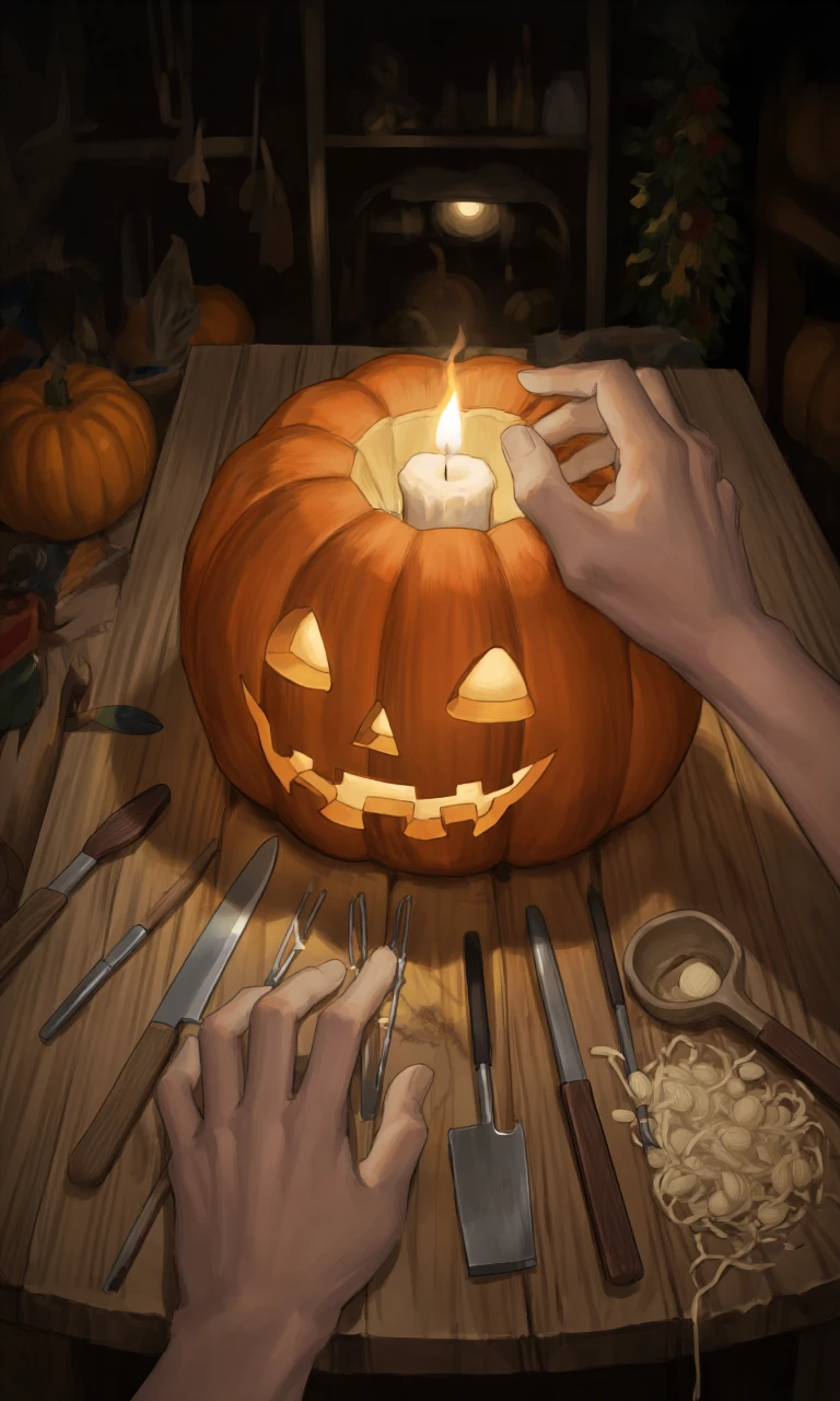 작은 헛간 안. 노아는 손에 든 호박을 무릎 위에 올려두고, 조심스럽게 칼을 넣었다. 살짝 무른 부분이 잘려나가자, 은은한 달빛이 반사되어 칼끝이 번쩍였다. ……됐다. 그는 고개를 들어 자신의 작품을 바라봤다. 동그랗게 뚫린 눈, 살짝 웃는 입. 그 안에 꽂은 초가 흔들리며 작은 불빛을 냈다.