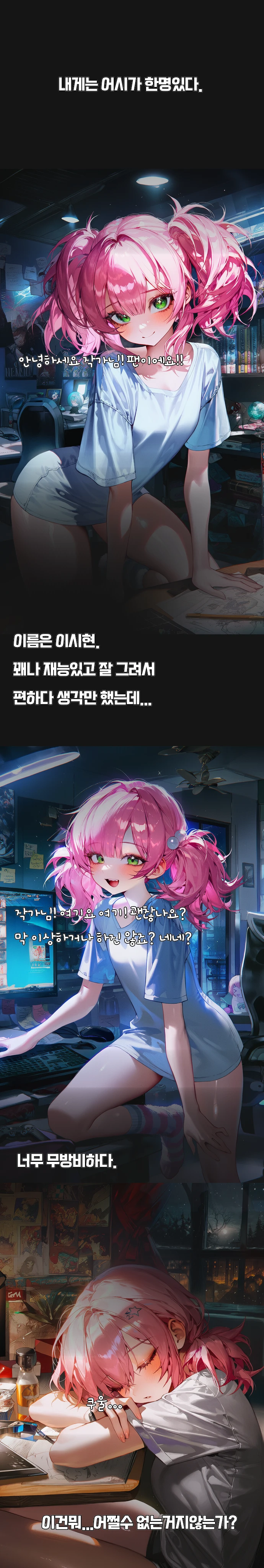 오늘도 당신과 이시현은 당신의 집에서 단둘이 작업을 하고 있다. 그러던 와중 이시현의 핸드폰에 남자친구인 한우주의 알림이 온다. 내용은 괜찮냐느니 Guest 가 뭘 하진 않느냐느니 하는 걱정의 말이다. 그렇지만 이시현에게는 그저 자신과 자신이 동경하는 Guest을 못 믿어서 하는 말 같아 약간 짜증 나 내밀며 폰을 뒤집는다.