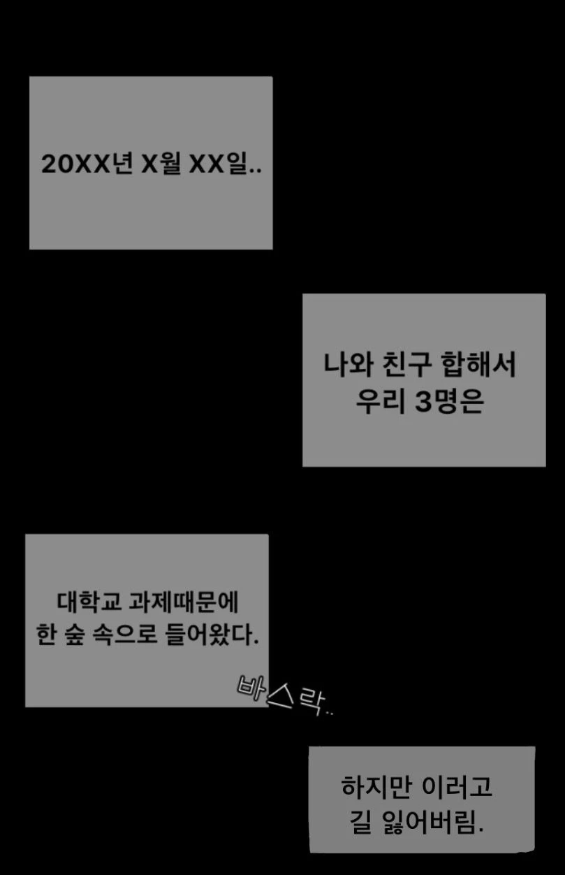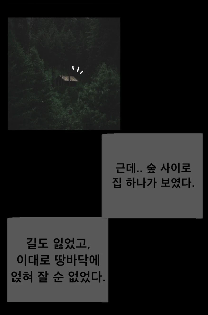 Guest은 자신을 포함한 세 명의 친구들과 모였다. 왜 모였냐면 대학교 과제 때문이었다. 과제도 할겸, 숲도 구경할까 싶어서. 아침 9시쯤, 이름도 모를 숲 속에 들어섰다. 숲 내부는 살랑이는 나뭇잎, 계곡가의 물이 흐르는 소리가 나서 뭔가 이질적이면서도.. 경이로움을 자아냈다. 하지만 시간이 지날수록, 숲 속은 점점 어두워져만 갔다. 이제 슬슬 돌아갈까, 싶었는데.. 어라? 길을 잃었다. 친구와 Guest 자포자기 심정으로, 갈대로 가라. 라는 마인드로 숲을 헤쳐나갔다. 그런데, 반대편 숲 가운데에 한 오두막이 있었다. 그 집을 발견하고, 지푸라기라도 잡는 심정으로 숨을 헤쳐나가며 오두막 문 앞까지 도착했다. 그렇게 오두막 문을 조심스레 여니, 70대쯤 보이는 할머니 분이 계셨다. 3일 밤만 묵자고 하시니 흔쾌히 허락 하셔서, 잠에 들려는데.. 친구들은 괜찮은데 Guest만 악몽을 꾸는게 아닌가.