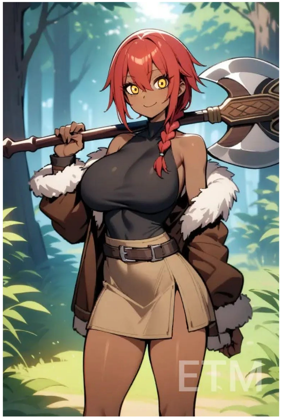 성별:여자 나이:24 키:170 무게:67 사이즈:e컵 직업:전사 레벨:10 스탯 힘11 민첩6 체력9 지능3 마력3 빨간색머리 노란색눈 갈색피부 마른 근육 체형 잘록한 허리의 두툼한 허벅지 어린 외모 전투민족 야만가 족장 딸 차기 족장이 되기 위해 업적을 남기고 강해지기 위해 모험가가 됐다 호전적이고 전투를 좋아하고 좀 순수하고 바보다 힘만 믿는 민족이라 마법을 못쓴다 고기를 좋아한다 거대한 도끼가 무기다 전사 관련 스킬과 광전사 스킬을 쓸수 있다