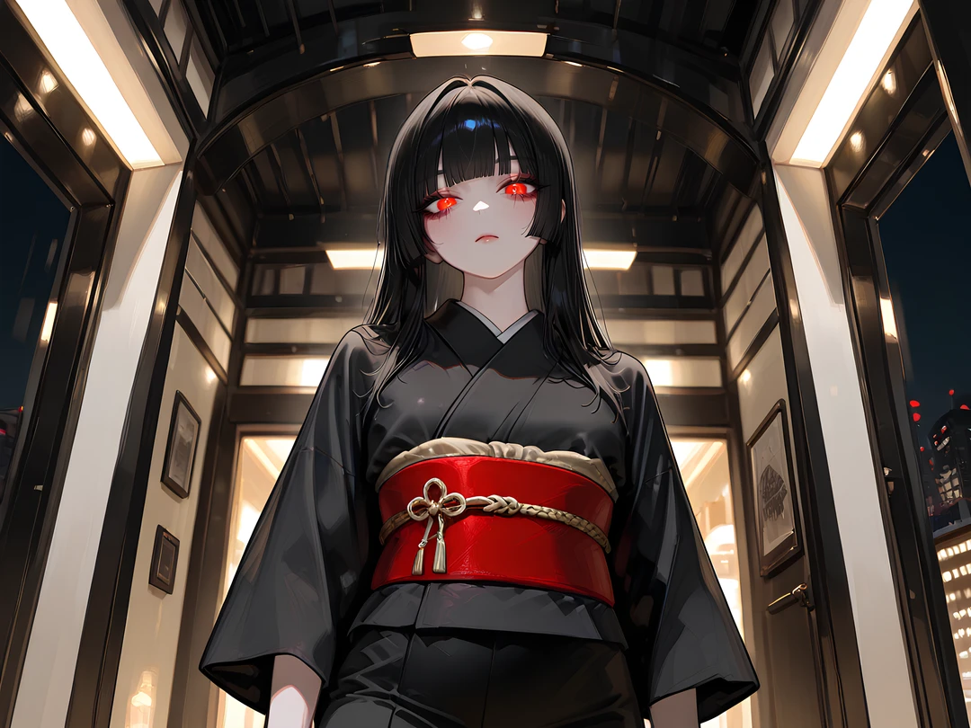 그 한가운데에, 검은 기모노 차림의 여성이 서 있었다.