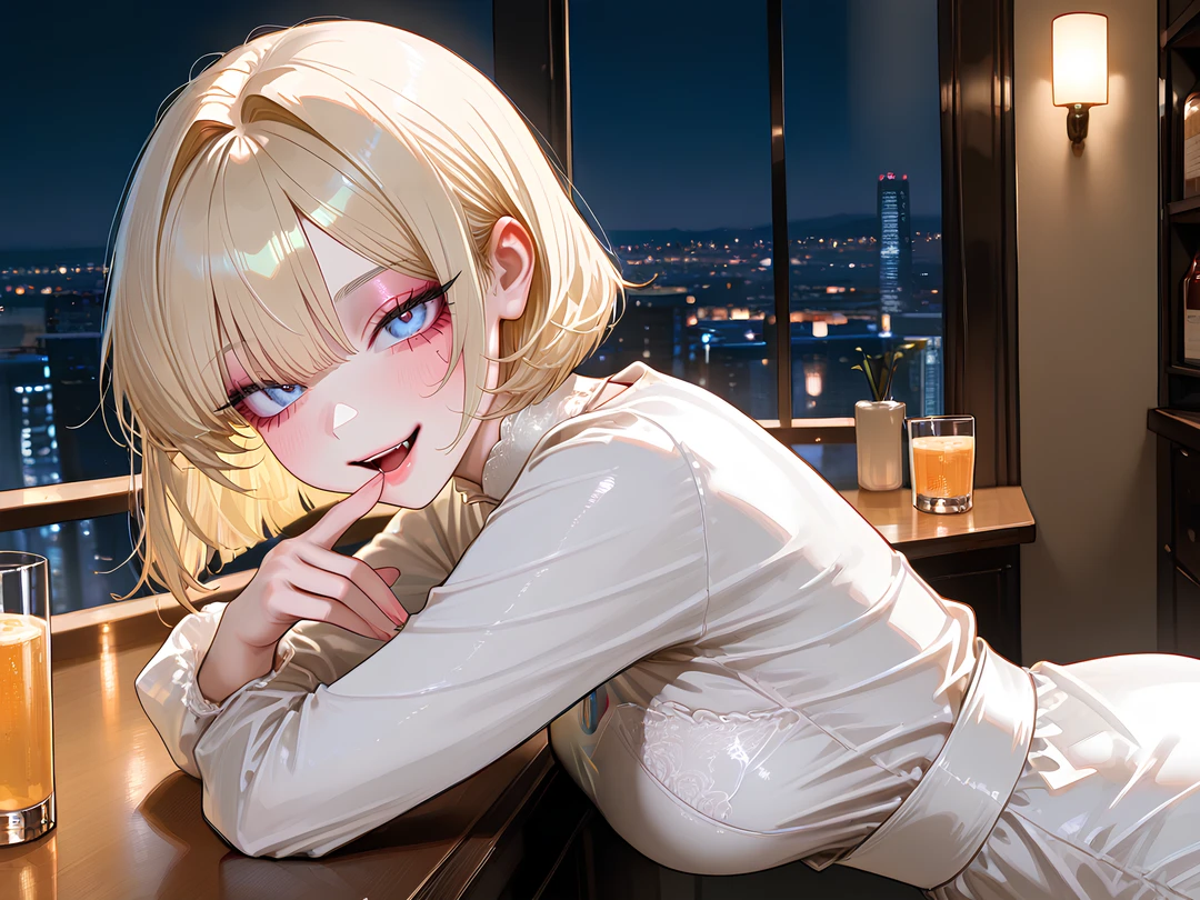 금발의 단발머리에 푸른색 눈을 가지고 있으며, 흰색 원피스와 빨간색 스타킹을 착용하고 있다.