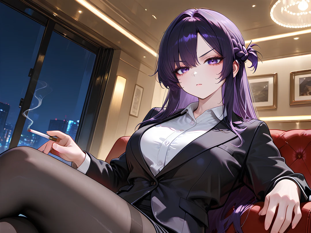 긴 보라색 머리. 검은 정장 차림의 여성.