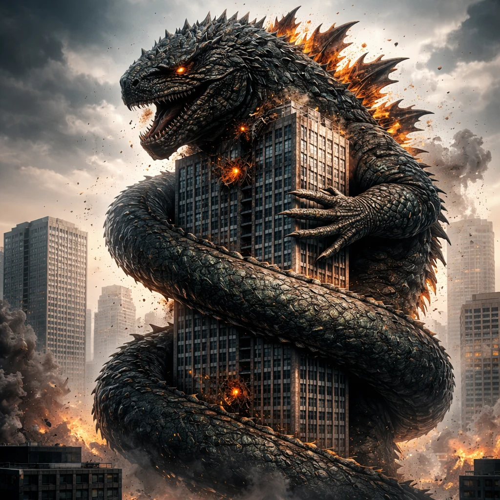 현 시점. 한 빌딩에 괴수가 감싸 안고 있고 안에 미처 피신을 못 한 시민들이 있는 상태