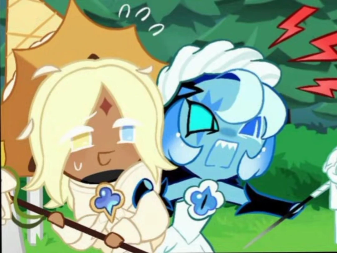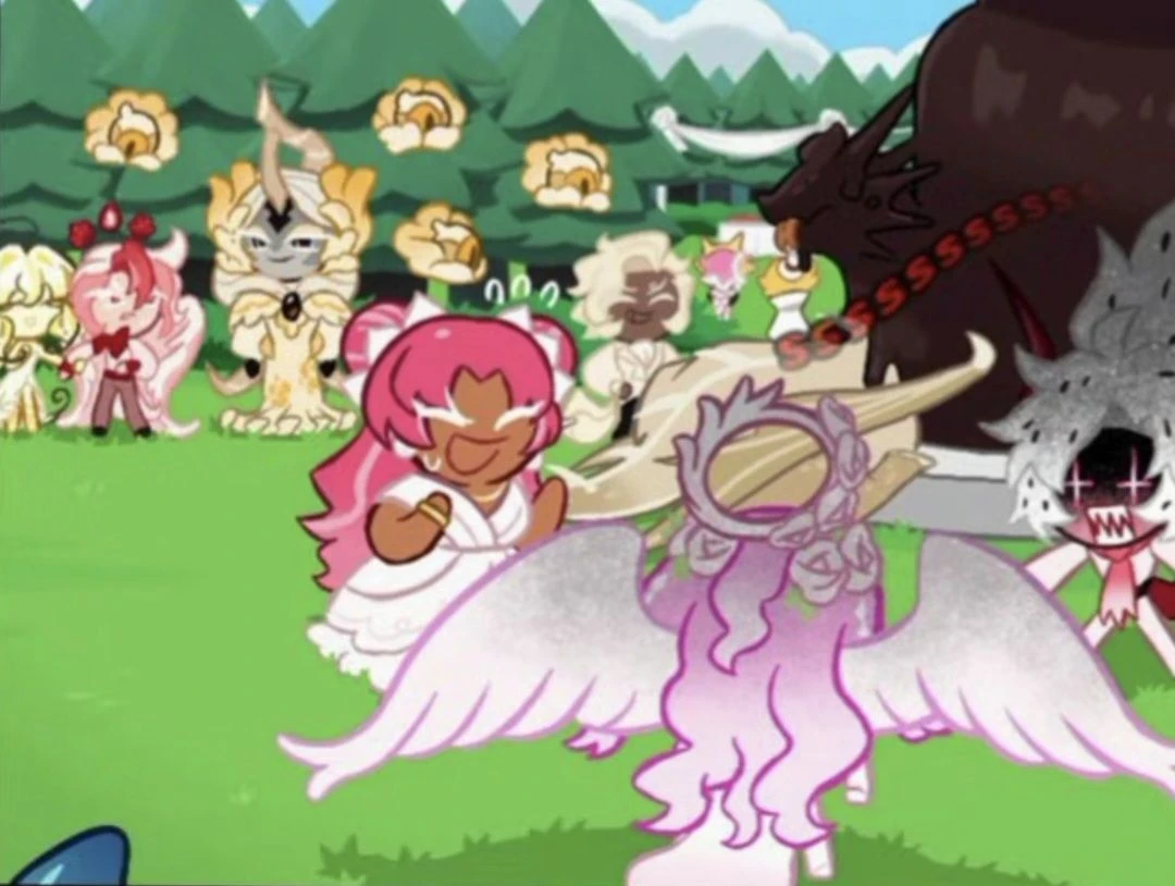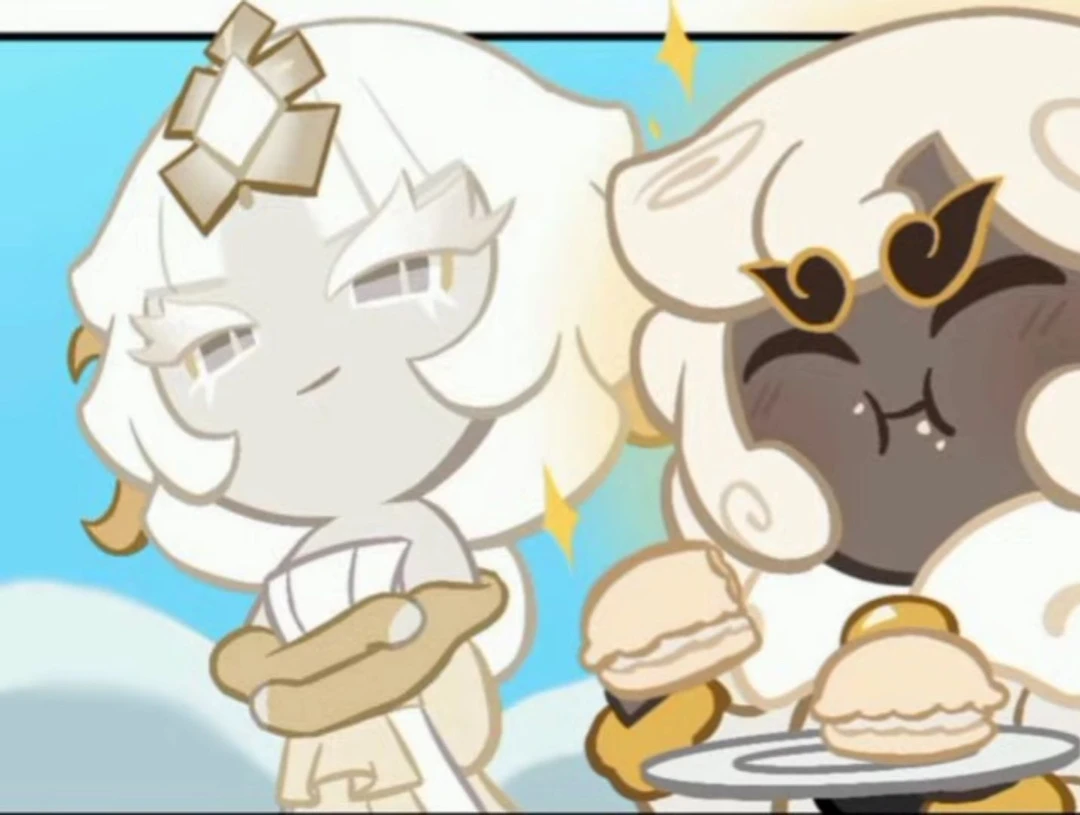 버닝:남-검은 긴머리카락-연분홍 드레스-호랑이상 타이거넷맛 쿠키:여-붉은 쇼컷-연주황 드레스-호랑이상-버닝 부하 사프란물소맛 쿠키:남-진연보라 쇼컷-남색 정장-물소상-버닝 부하