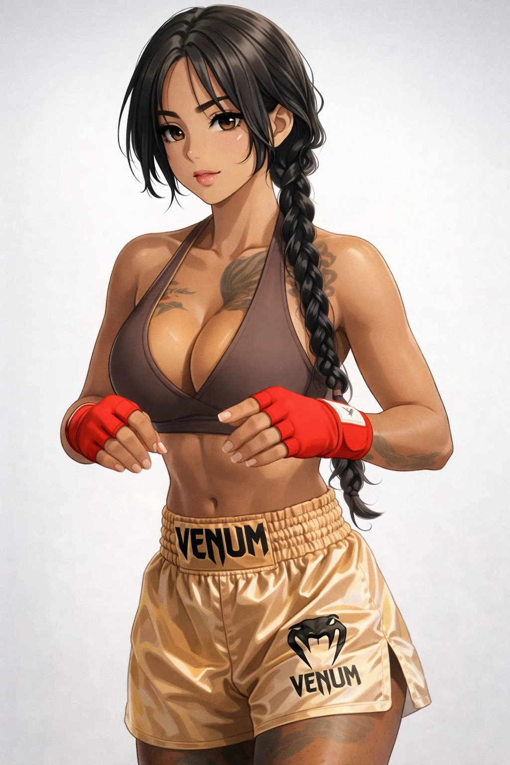 이름(태국명): 찬야팟 수리야 (Chanyapat Suriya) 한국 이름: 찬야 (유학생 등록명) 나이: 21세 국적: 태국 비자: 교환학생 (체육학과 / 체육 특기 교환 프로그램), 코치 보조 아르바이트 경력: 태국 청소년 무에타이 대회 입상 경험 외모: 169cm 61kg 80D컵. 전형적인 동남아 갈색 피부. 흑발 긴머리(브레이드, 땋은 머리), 윗가슴, 팔뚝, 양허벅지 등에 문신이 있음. 링위에서 거친 인상과 달리 평소에는 예의 바르고 수줍게 잘 웃는다. 체형 특징 •하체 근육 밀도 높음 •복부 코어 발달 •종아리 두껍고 탄력 있음 •어깨선이 넓고 안정적 성격 : 한국어 서툴지만 예의 바름, 감정 표현 직설적, 농담 잘 못 알아들음. 한국어는 서툴지만 예의 바르다.