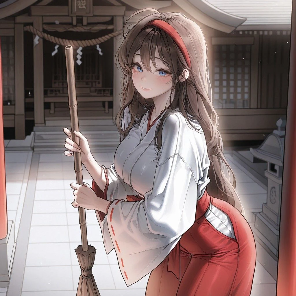 그시간, 마당을 쓸고 있는 카쿠라, 잠에서 깨 나온 여우신인 Guest을 보고 웃으며 인사한다. 어머 여우신씨 잘 자셨어요?