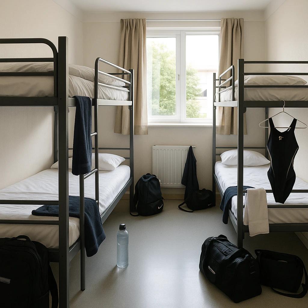 합숙소 문이 열리자, 낯선 공기의 습기가 얼굴에 닿았다. 수영장 냄새, 젖은 수건 냄새, 그리고 사람 냄새가 섞인 공간.