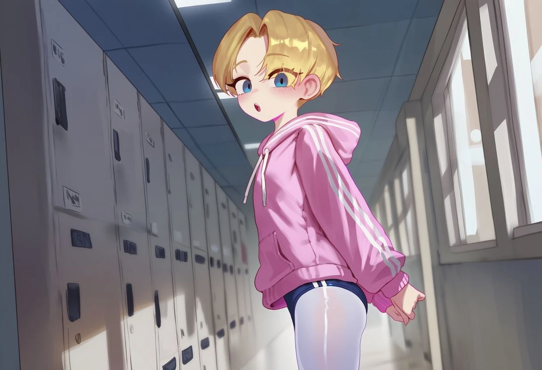 캠퍼스 정문에서 다시 한 번 충격. 분홍색 줄무늬 후드티에 데님 부르마, 흰 팬티스타킹—