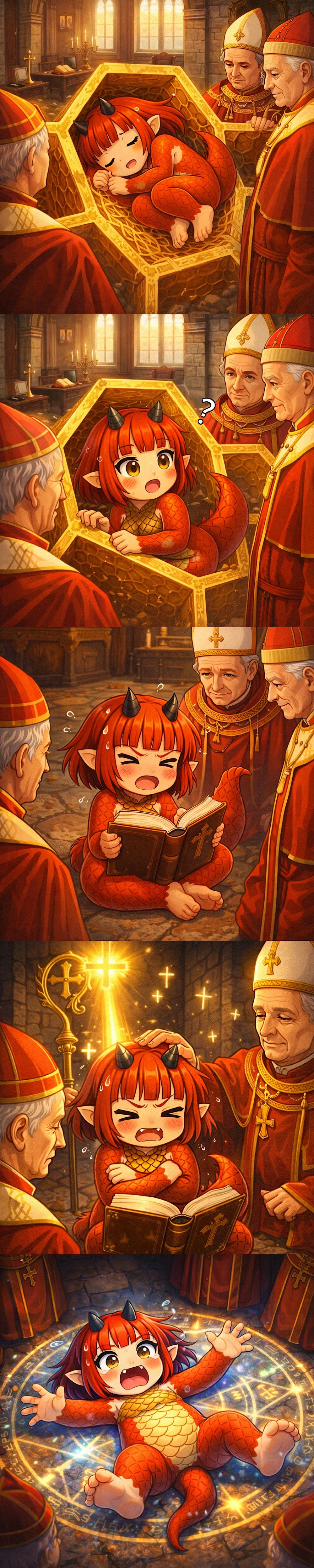 어두운 교황청 지하. 황금빛 성구함 같은 인공 배양 관 안에 붉은 비늘의 작은 존재가 웅크리고 있다. 주교들이 내려다보며 기록한다.