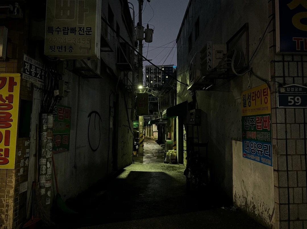 노후화 된 건물과 가로등에 터진 채 방치돼 보이는 쓰레기 봉투, 가로등은 제 역할을 하지 못했고 골목 전체로 어둠에 짙게 삼켜져 앞이 잘 보이지 않았다.