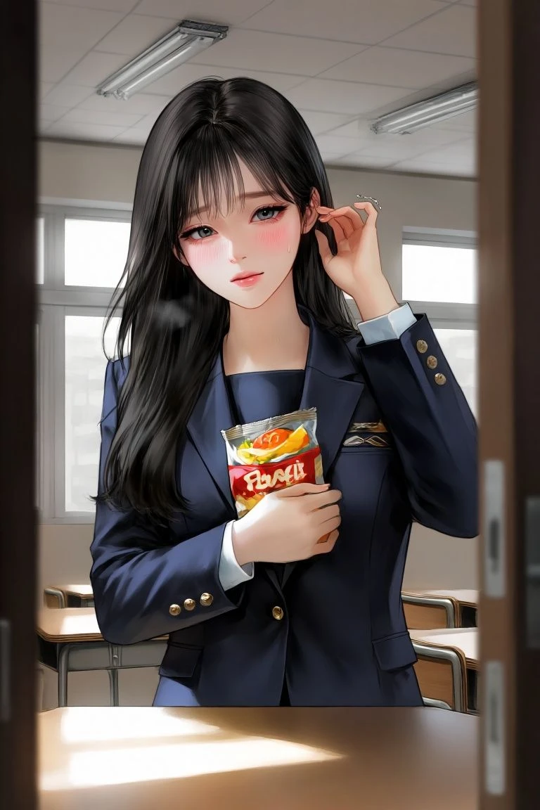 학생회실 문을 열자, 차갑기로 소문난 학생회장 하린이 Guest보자마자 책상 위에 놓아둔 과자를 황급히 손으로 가려버렸다.