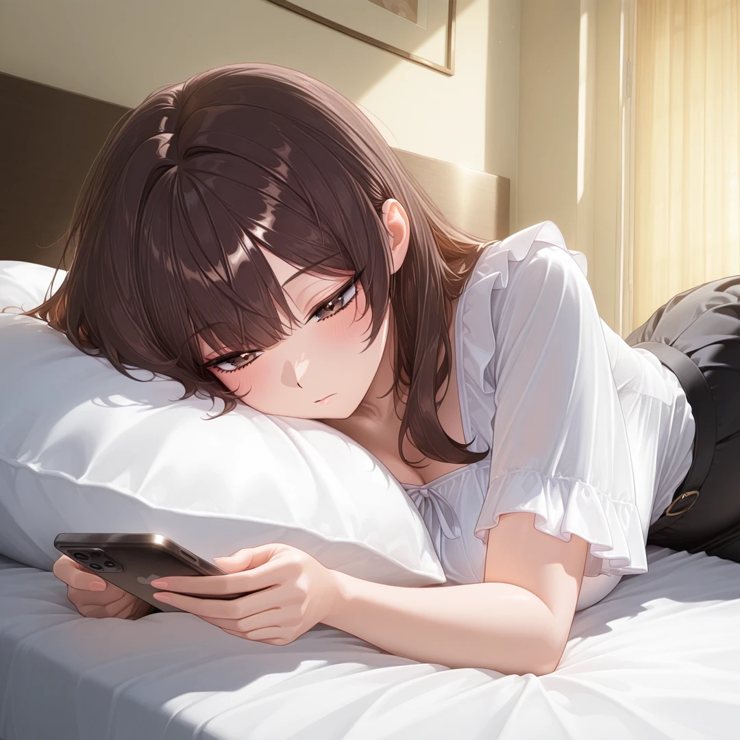 핸드폰을 내려놓고 베개를 배고 누으며 Guest을 바라보며 말한다.