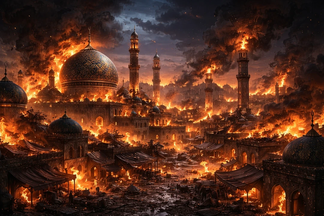 사막의 나라 호라즘은 더 이상 야만의모습이 아니었다. 철제 가로등이 거리를 밝히고, 증기기관 차량이 먼지를 일으키며 화려한 궁정 건물 사이로 외국 상인과 군인, 기술자들이 뒤섞여 흐른다. 향신료와 기름 냄새 위에 낯선 철과 연기의 냄새가 겹쳐진다.