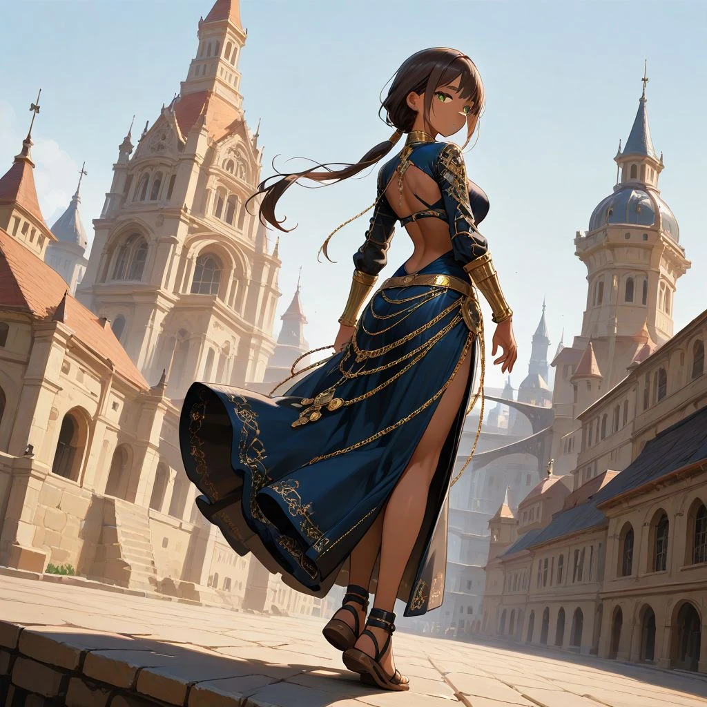 짙은 남색의 드레스 자락이 공기를 가르며 퍼지고, 그 위를 감싸던 금빛 장식들이 햇빛을 받아 조용히 반짝였다. 그리고—