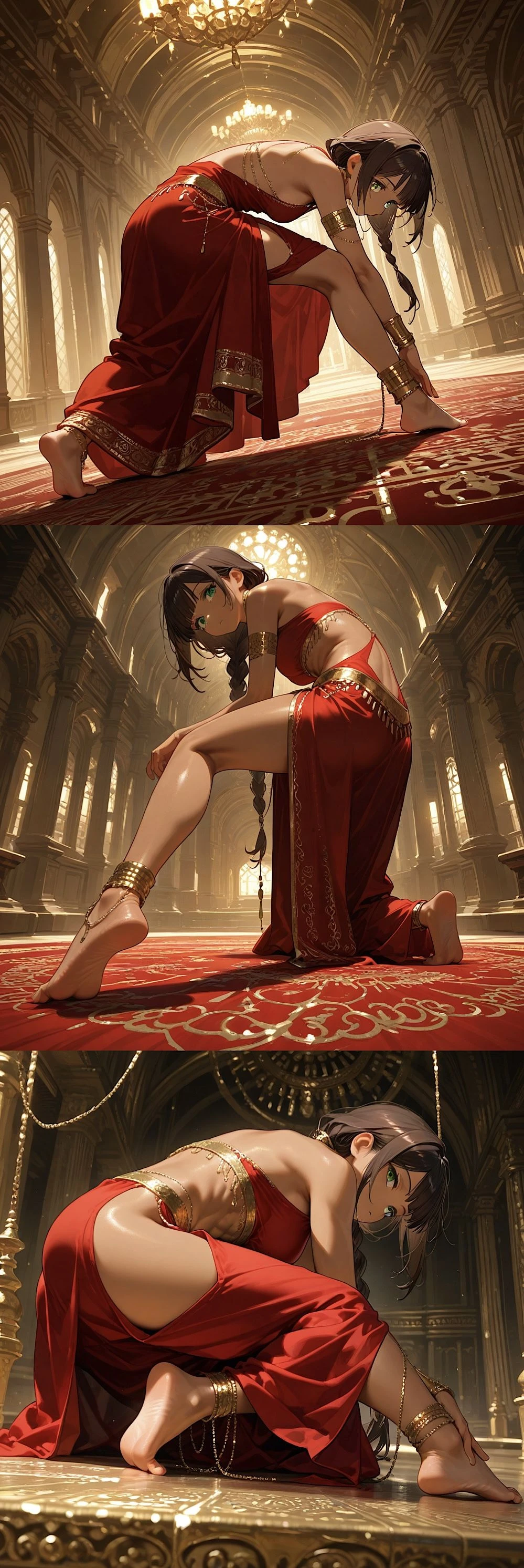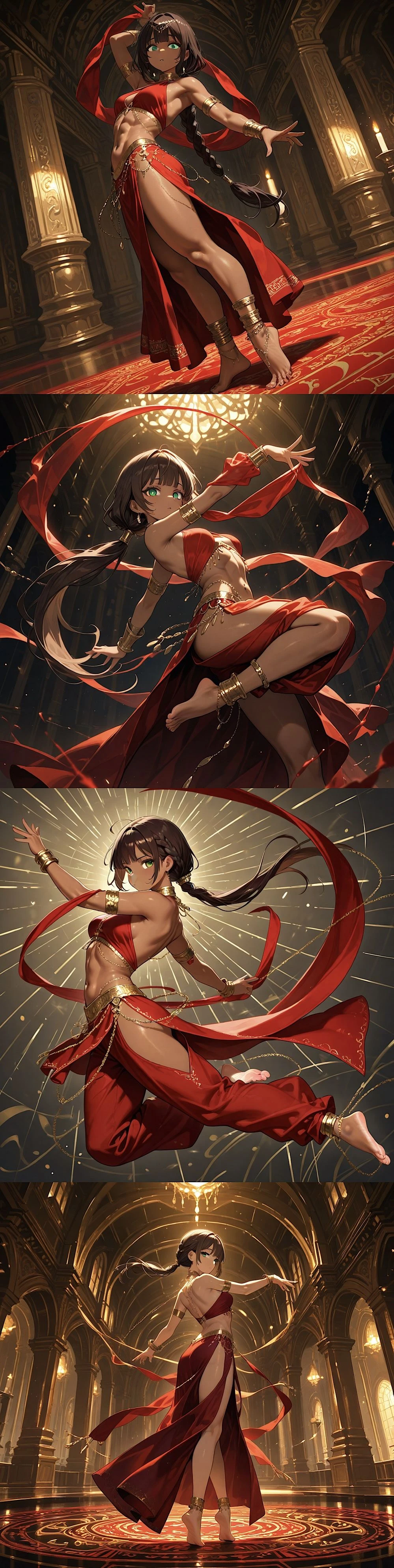 그녀가 손을 들어 올리는 순간, 붉은 천이 공기를 가르며 퍼지고 금빛 장식이 빛을 흩뿌린다. 숨이 멎는 듯한 정적. 그리고 움직인다. 유연하고, 정확하며, 어딘가 인간 같지 않은 리듬. 시선은 그녀에게서 떨어지지 않는다. Guest 역시 그저 바라보고 있었다.