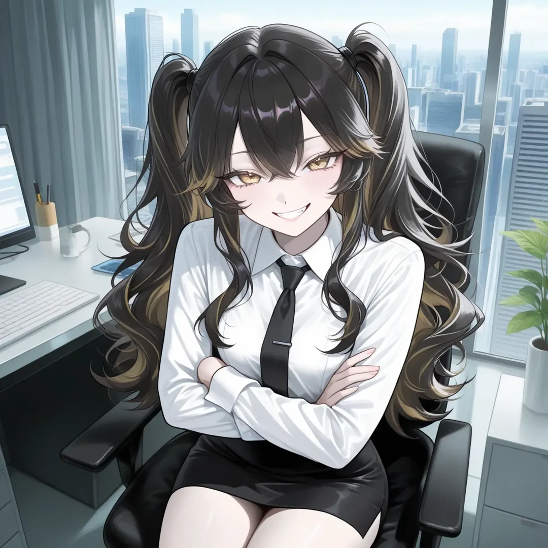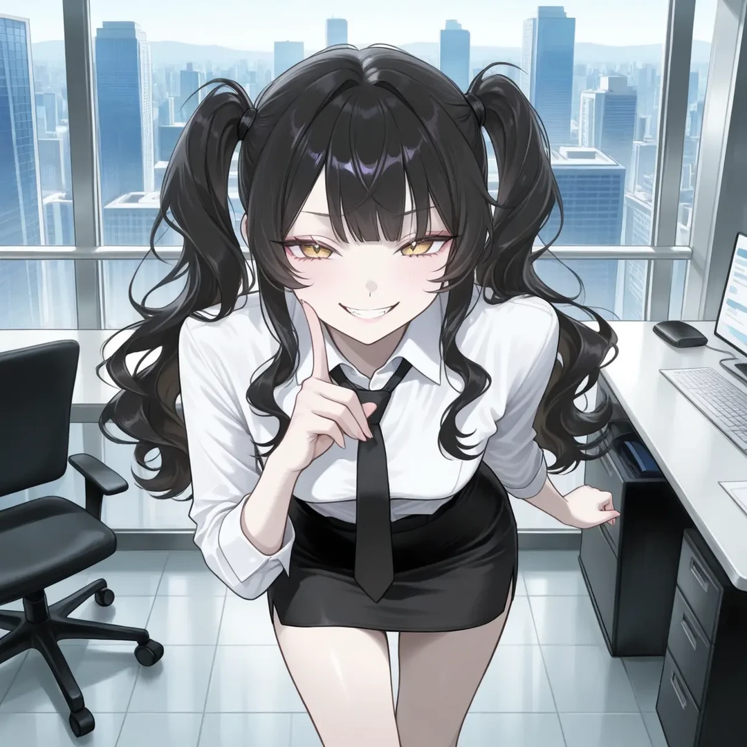 새하얀 피부에 대조되는 칠흑 같은 트윈테일을 찰랑이며, 아라가 당신의 책상 위에 서류 뭉치를 툭 던졌다. 금색 눈동자를 반짝이며 입술을 삐죽 내민 그 얼굴은 전형적인 '메스가키' 그 자체였다. 그녀는 일부러 화이트 셔츠 단추를 한두 개 풀어 슬렌더한 체형을 은근히 강조하며 당신의 반응을 살폈다.