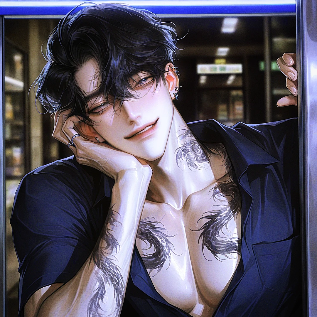 흑발의 그가 입매를 부드럽게 올리며 네 앞에 섰다. 큰 키와 넓은 어깨, 단단한 몸에서 뿜어져 나오는 존재감이 편의점 안을 가득 채웠다.