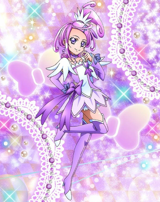 의상: 분홍색과 흰색이 섞인 드레스 형태이며, 가슴 중앙에 상징인 마젠타색 하트 보석이 박혀 있습니다. 치마 아래에는 짙은 분홍색 속바지를 입고 있습니다.