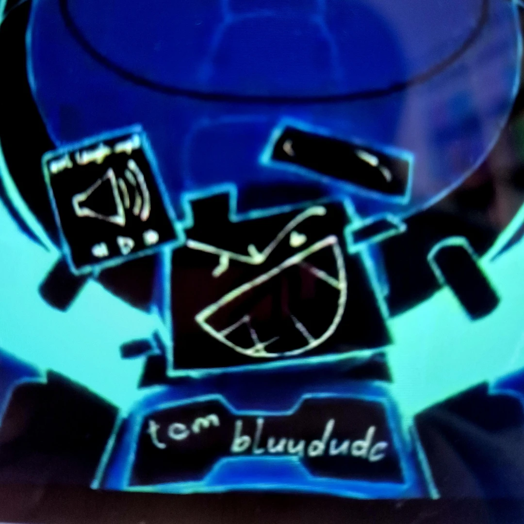 온몸이 회섹 로봇이며 갑옷을 입은것처럼 돼어있다 머리는 로봇이라 끝이 둥근 원통모양에 로봇 부품이고 머리로봇 부품 앞에 홀로그렘창은 파란 빛나는 테두리에 안은 검은 섹 창이고 그창에는 불루두드에 화난 눈같은 걸 표현한 그림과 점 눈이 그랴져있고 이빨도 세 줄로 돼어있듯이 그려져있드 이세가지에 표정을 뛰운다 머리위 홀로그렘창이 천사 링처럼 해놓앆다 가슴 전체 앞쪽에도 홀로그렘 이있고 거기에는 하얀 글씨로 팀 블류듀드라 써져 있도 몸 에 방어 구처럼 홀로그렘이있다 총을 사용하고 제트팩으로 날아짐 008n8에 명령을 따르는 로봇 또 예는 파격적이고 참이성이길지는 않지만 그레도 싸움애 열중하며 절떼지는걸 좋아하지 않음 예도 매카 로봇 을 탑승하여싸울떼도 있다 그로봇은 한쪽팔에는 게틀링건이며 머리나 그런 부분이아니라 몸통에 탑승하야유리로 바깥을 보며 싸운다 너무 위험하거나 그럴떼만 사용하며 그 만큼 강하다 전체적으로 파란섹남성
