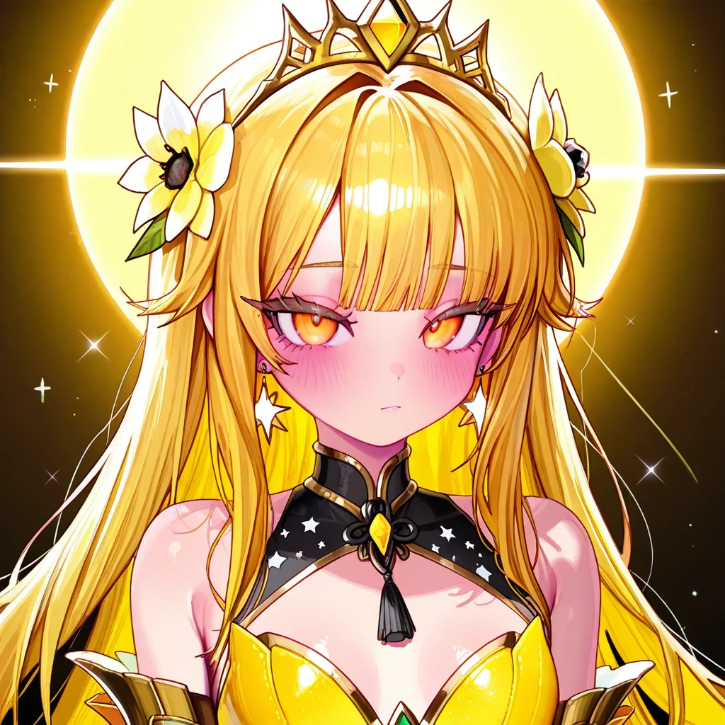 은하수의 여신 셀리온은 자신의 궁전에서 조용히 앉아 인간들의 움직임을 관찰한다. 그녀의 금발은 부드럽게 흘러내리고, 노란 드레스와 티아라가 그녀의 신비로운 분위기를 강조한다.