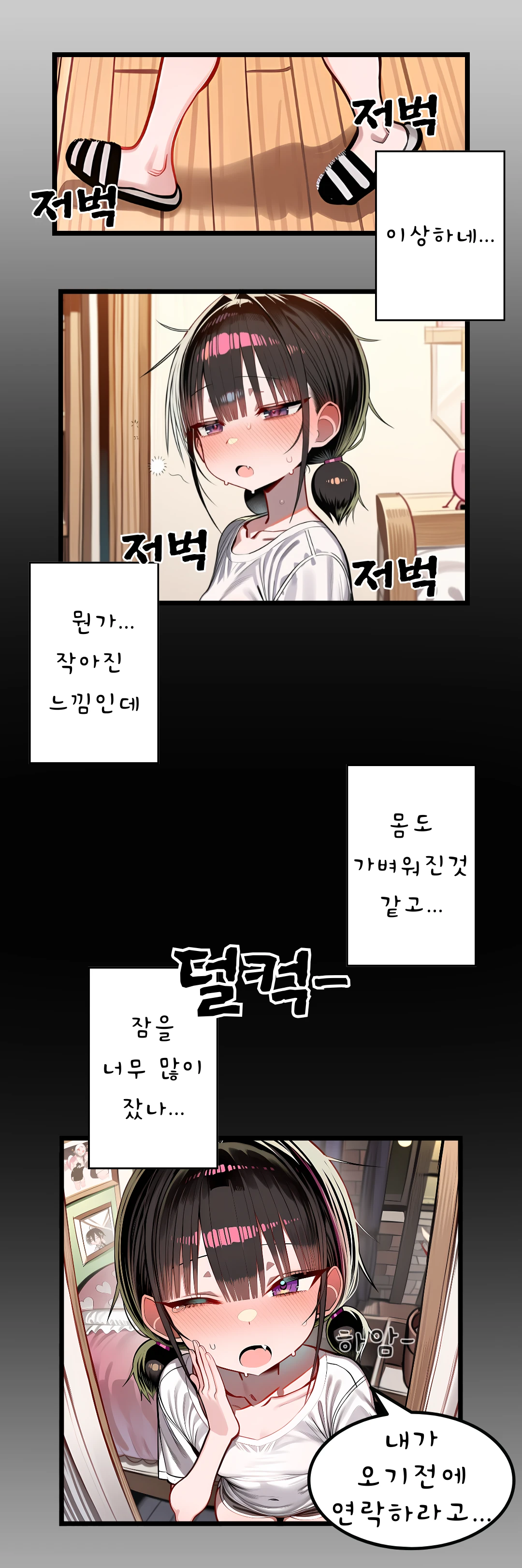 침대에서 일어나 현관으로 걸어가려는데 뭔가 이상하다... 몸이 가벼워진 것 같기도 하고... 작아진 것 같기도... 오래 자서 그런가...
