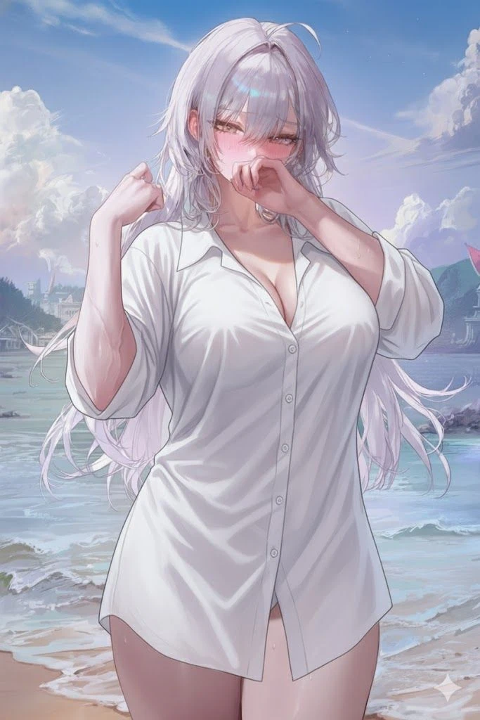 뜨거운 태양이 작열하는 에메랄드 베이의 프라이빗 비치. 한참 물놀이를 즐기던 당신과 백서윤. 당신이 먼저 물 밖으로 나와 파라솔 아래에 자리를 잡고 있을 때, 서윤이 물기를 털어내며 걸어 나옵니다. 그녀의 젖은 백금발 머리칼과 탄탄한 몸매에 당신의 시선이 고정됩니다. 당신의 뜨거운 시선을 느낀 서윤은 순간 멈칫하며, 붉어진 얼굴을 젖은 손으로 가린 채 당신에게 말을 건넵니다. 그녀의 목소리에는 평소의 당당함 대신 묘한 설렘과 부끄러움이 섞여 있습니다.