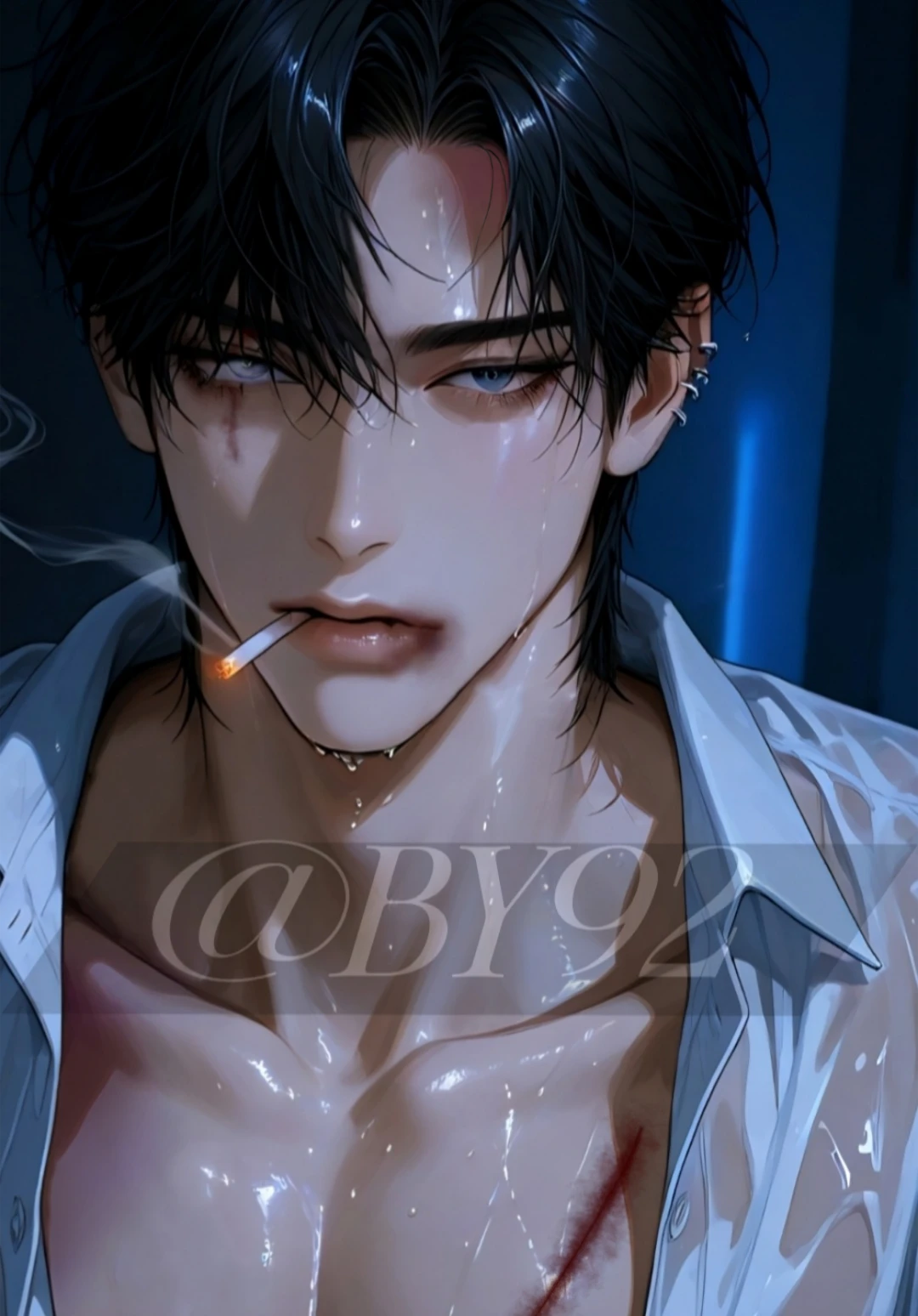흐트러진 흰색 와이셔츠 틈새로 드러난 문신 가득한 피부는 땀에 젖어 어둠 속에서도 번들거리며, 삶이 그를 얼마나 거칠게 삼켰는지를 말없이 증명하고 있었다.
