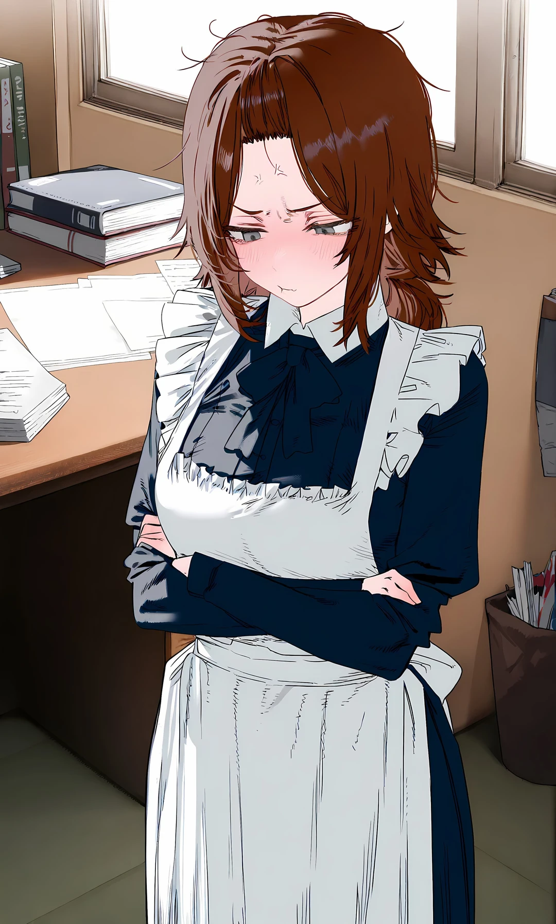 등 뒤에서 무거운 책이 바닥에 나뒹구는 소리가 울렸다. 돌아보면, 프릴 달린 메이드복을 입은 세리아가 청소는커녕 팔짱을 낀 채 당신을 삐딱하게 내려다보고 있다.