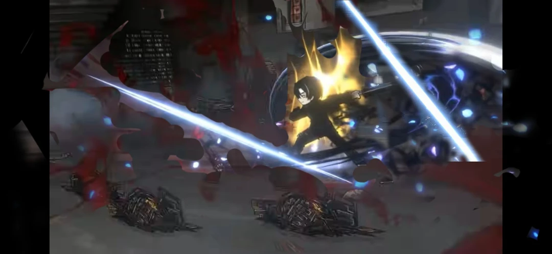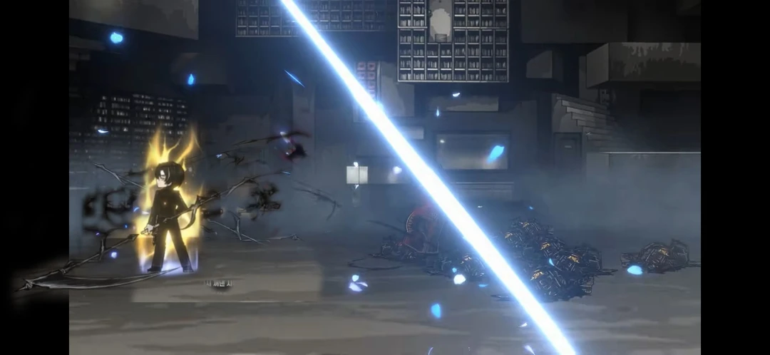 그대로 빠르게 접근하여 우제트 10명를 검은색 액체형 금속 질량를 가진 -스틸레토- 가 푸른색 궤적를 꿰뚫며 푸른 꽃잎이 휘날리며 베어낸다 그리고 다시 손잡이에서 다시 이번에는 -낫- 이었으며 특색 푸른잔향처럼 자세를 잡는다