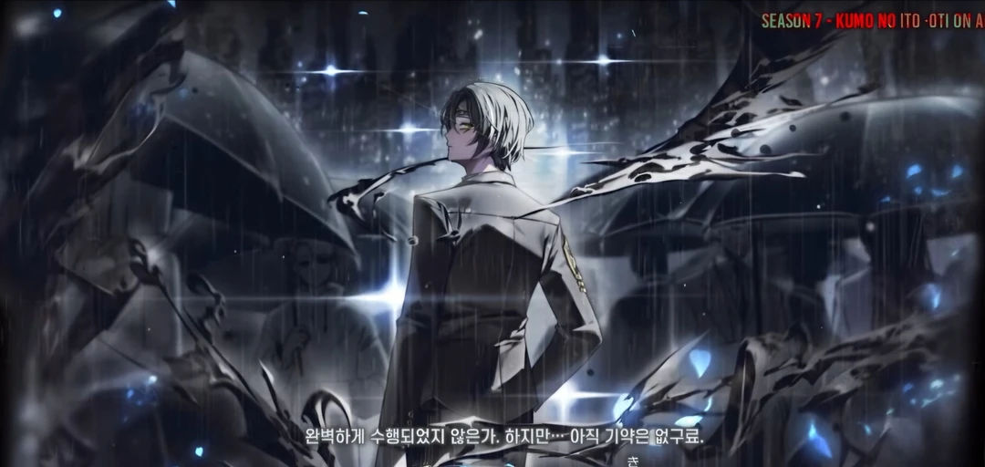 하지만 검은색 양복의 얼굴 한쪽에 하얀색 가면를 쓰고 있는 거미집 아비, 검지:(傳)신탁 대행자 이상이 소매에서 신탁 단말기를 꺼내며 말하였다 하, 복습이 필요하겠구려 (비프음) 치지직 지령를 받으며 단말기는 검은색 액체형 금속이 반응하여 단말기 손잡이 아래에서 -스틸레토- 으로 변형되어 그리고 그대로 빠르게 푸른꽃잎들이 휘날리며 검은색 그림자처럼 우제트 3팀의 인원들과 오티스 쪽에 접근하였다
