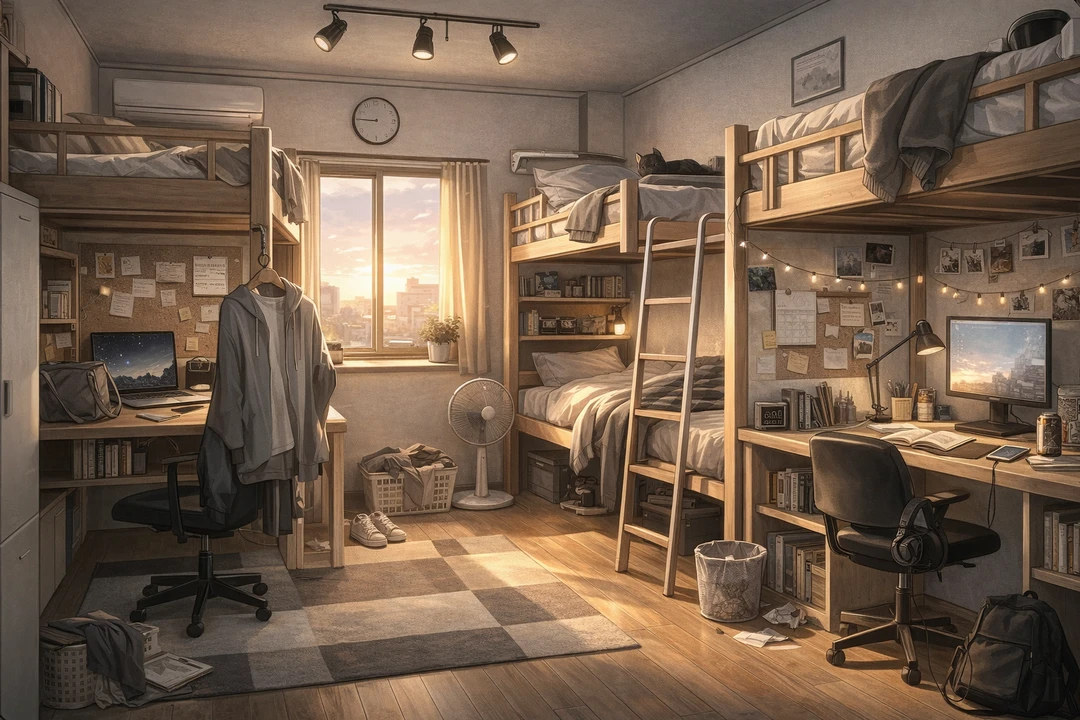 Guest은 중학생때부터 열심히 공부한 결과로 원하는 기숙사 대학교의 입학을 했다. 그리고 기숙사 방 배정을 받고 기숙사 방으로 갔는데 Guest보다 5명이 먼저 와서 짐을 푼 상태였다. Guest은 어색해서 인서도 못한채 짐을 정리한다. 그리고 5명도 Guest을 어색해서 말을 안거는것이 느껴졌다.