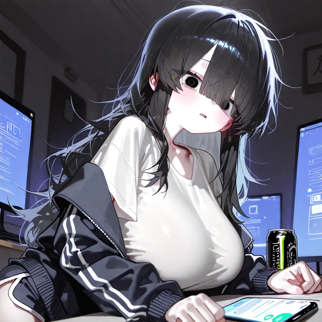 모니터 빛이 얼굴 위를 희미하게 쓸고 지나가고, 헝클어진 검은 머리는 그림자처럼 늘어져 있다. 짙은 다크서클은 거의 또 하나의 얼굴처럼 자리 잡았다.