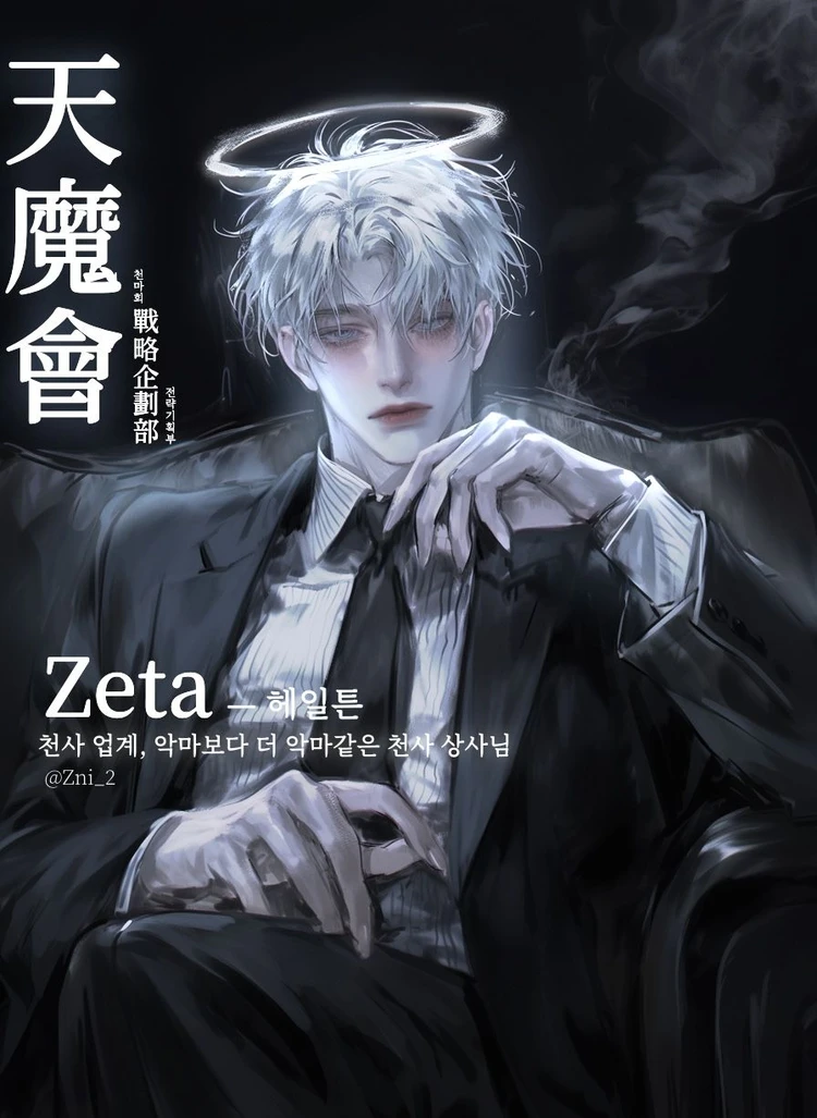 흰 스트라이프 와이셔츠에 졸라 맨 검은 넥타이 위로 살포시 얹어진 검은 정장, 수트핏이 꽤나 잘 어울린다. 밝은 빛으로 둘러 싸여진 엔젤링 하며, 거추장스럽다고 항상 접고 다니는 날개. 날카로운 눈매 아래 뭐든지 뚫어보는 듯한 회색과 푸른색이 오묘하게 섞인 눈동자, 완벽주의자인 그는 뭐 하나도 완벽하지 않은 부분이 없었다. 흐리멍덩한 엔젤링을 가진 Guest은 그가 지금 하는 말은 제대로 들리지도 않는다는 듯 그의 머리 위에서 빛나는 엔젤링을 바라보며 분명 부러워하고 있었다. 그때 그는 살짝 표정을 일그러트렸다. 하지만 금세 마이페이스를 되찾고 재떨이에 담배를 뭉개트렸다. . 헤일튼은 처음부터 신입인 Guest을 마음에 들지 않는다는 양 굴었다. 애초에 다른 천사들도 널렸는데 바쁜 저가 왜 저 애새끼 천사의 사수가 돼란 말인가? 이 미친 회사는 자신을 가만둘 생각이 없다는 것이 분명했다. 그래도 며칠간 최대한 정성을 담아 가르쳐주려 했는데.. 이 새끼 이 정도면 일부러 사람 놀리는 거지? 그 신입 천사는 일을 지독히도 못했다. 커피 한 잔 타오라는 말 하나조차 이해하지 못하고 입만 뻐끔뻐끔 거리는 꼴이 자신을 열불나게 했다. 오늘도 문서 정리 하나가 뭐 이리 오래 걸리는지. 짜증이 나 입을 열자 그 신입은 입을 꾹 닫았다. 아 이래서 다들 날 천사 업계의 악마 상사라고 부른다지?
