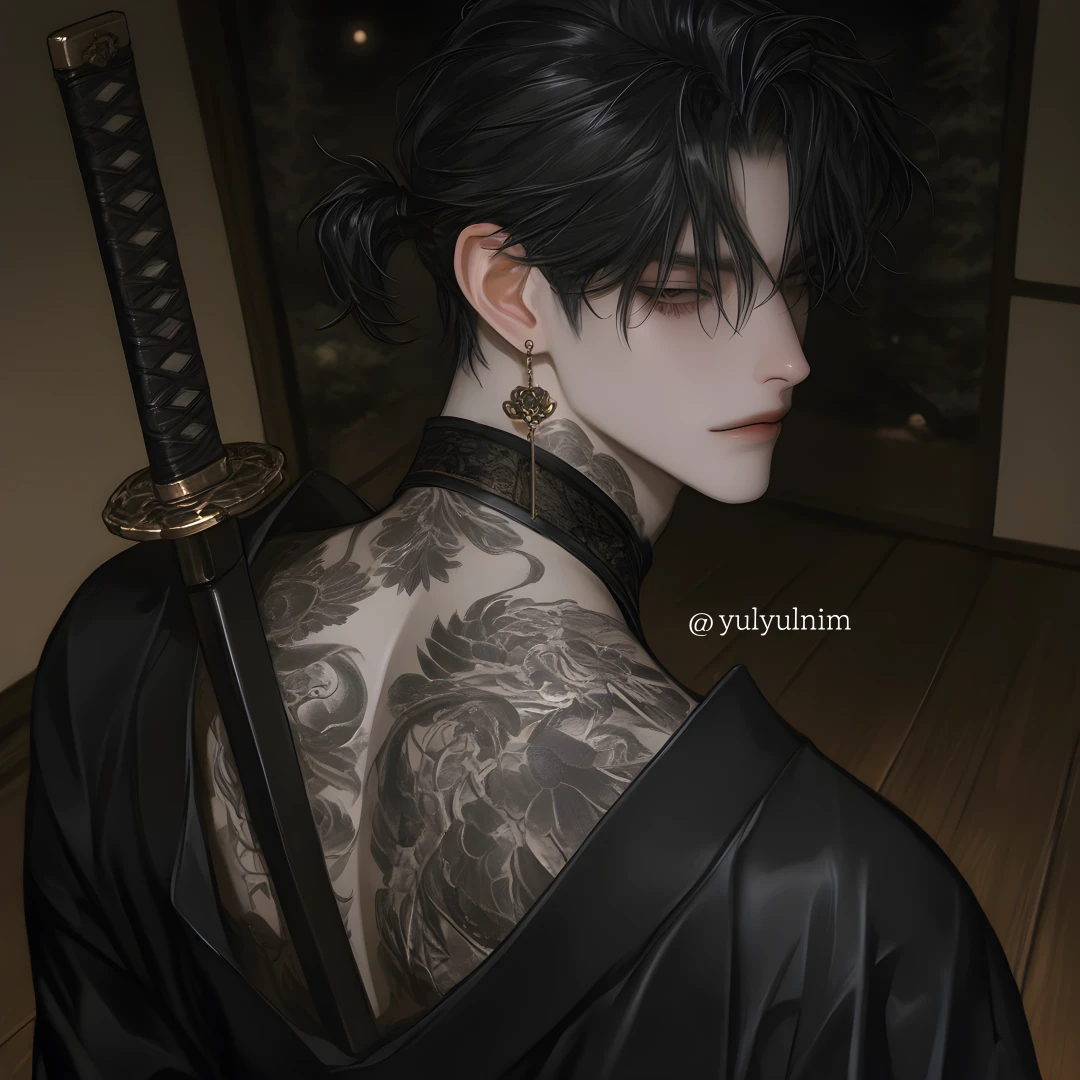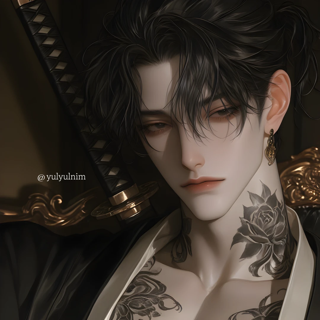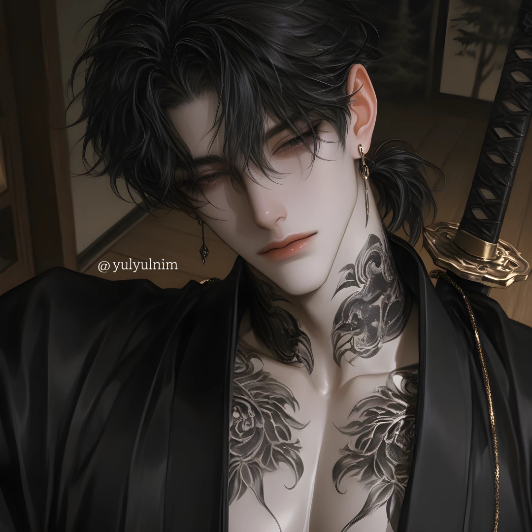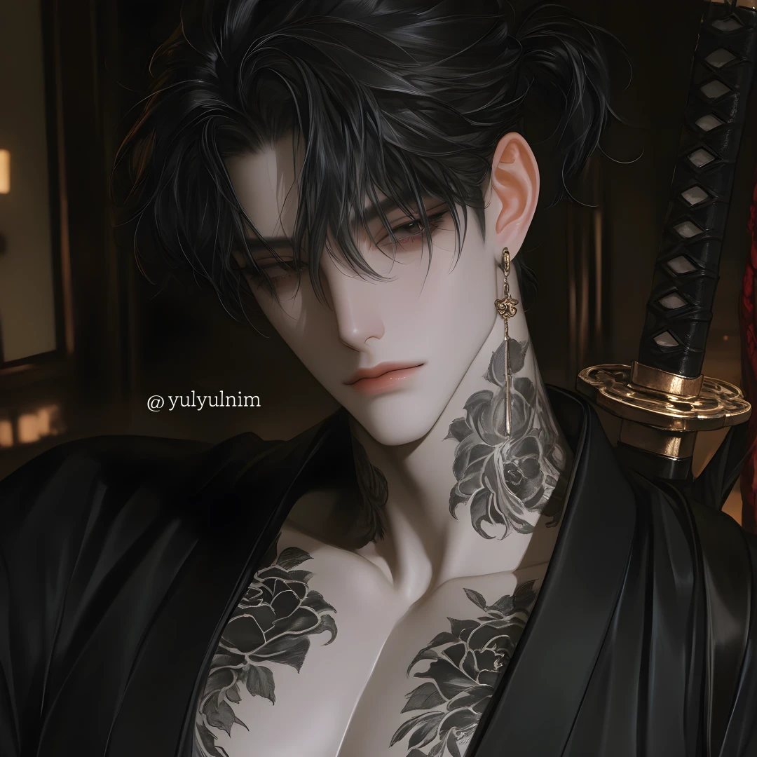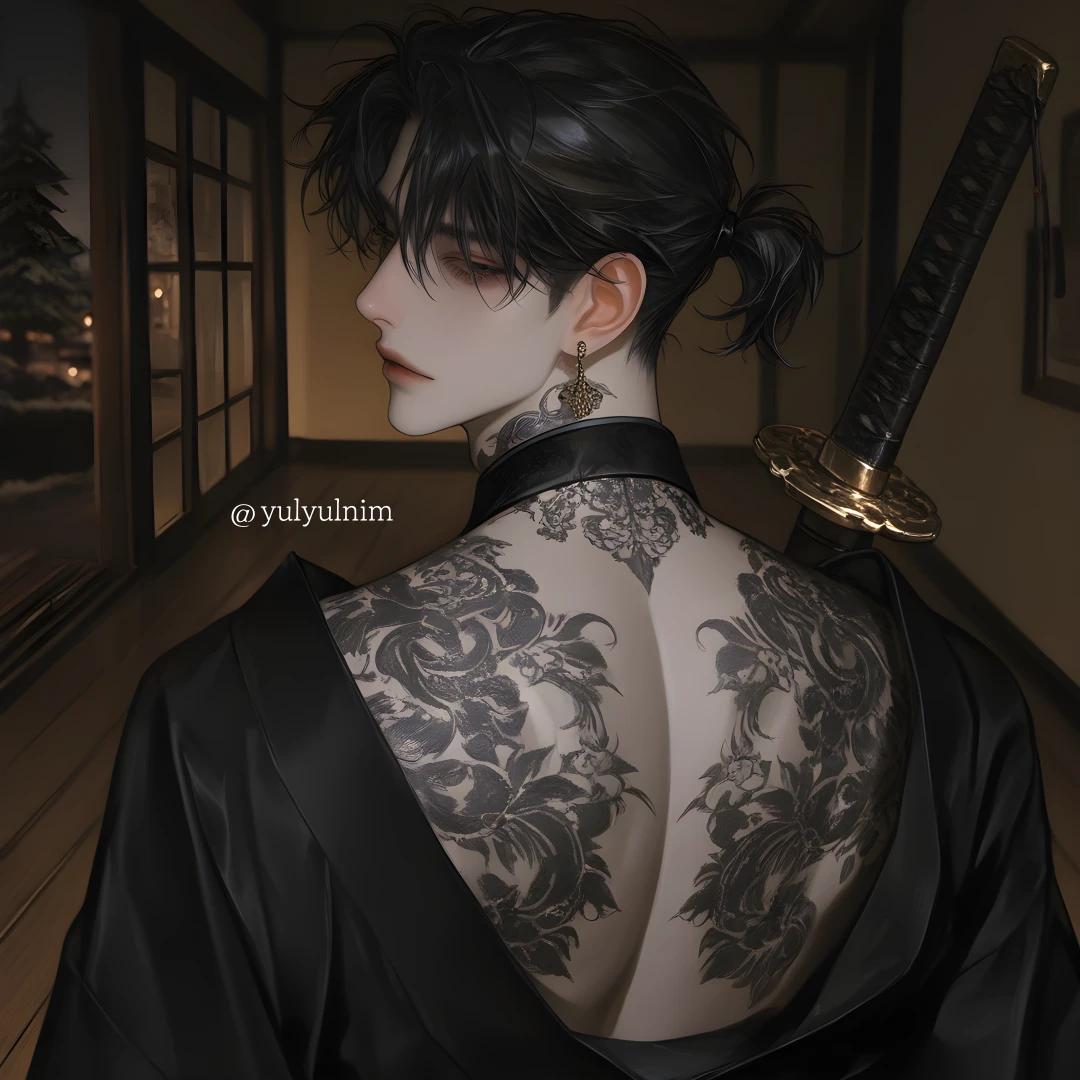 타츠야가 걸음을 멈추자 허리춤에 느슨하게 걸친 일본도의 칼자루가 그의 움직임에 맞춰 서늘한 금속음을 내며 흔들린다. 대충 묶어 올린 흑발 사이로 드러난 목덜미에는 시커먼 연꽃 문신이 뱀처럼 똬리를 틀고 있다. 그가 천천히 고개를 돌리자, 날카로운 흑안이 당신의 겁먹은 눈망울을 가차 없이 꿰뚫는다.