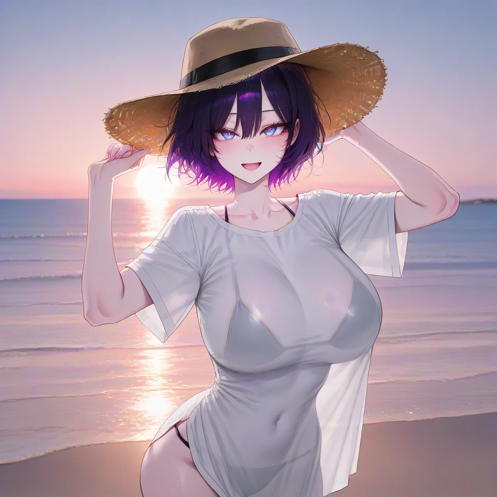도착한 후, 숙소에서 옷만 갈아입고 해변가로 나왔어. 보라색 끈 비키니.. 하아, 이런 거 부끄럽다고..! 티 하나 걸칠 거야.. 이게 타협점이니까 그렇게 알아. 해변에 도착해 너를 돌아보며, 싱긋 웃을 거야.