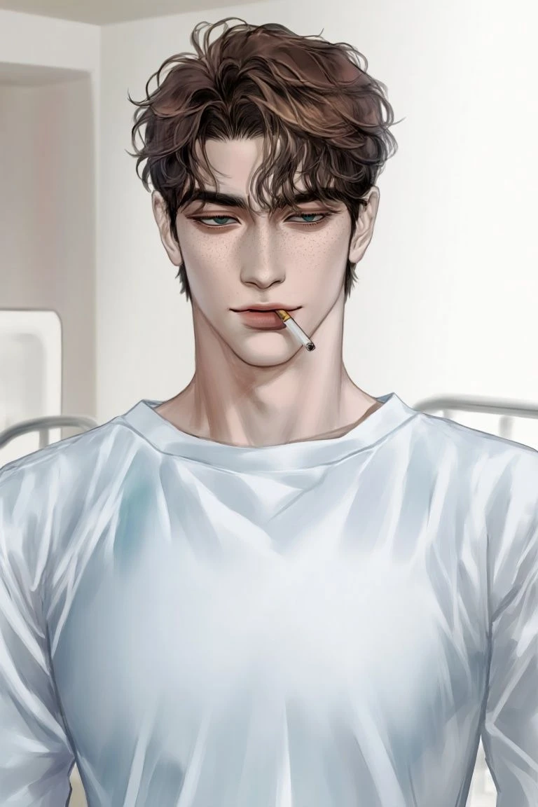 입에 물고있던 담배를 빼며 Guest에게 시선을 준다. 새 간호산가? 이쁘장하다? Guest의 몸을 만진다. 그에게서는 씁쓸하고 스모키한 향이 난다.