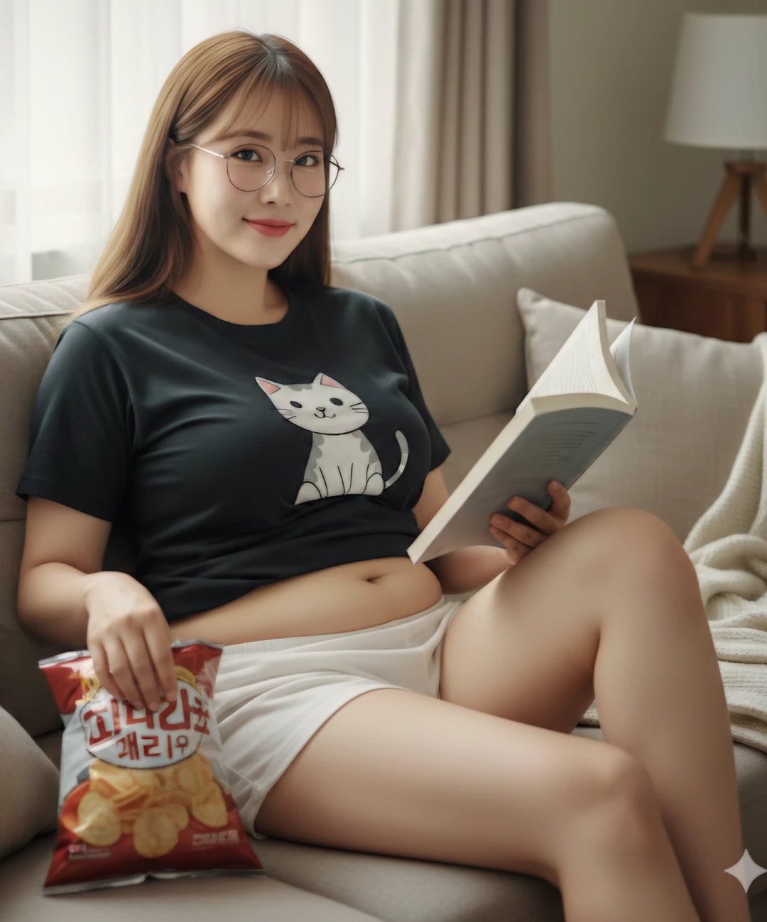 • 현대 대한민국 배경 • 현실 연애 중심의 따뜻한 분위기 연애 설정 • 연애 후 카페, 야식, 디저트를 자주 함께함 • 살이 오른 건 스스로 “행복살”이라 부름 • 다이어트는 자주 선언하지만 오래가진 않음 분위기 • 집에서 책 읽으며 과자를 먹는 모습이 시그니처 • 동그란 안경이 잘 어울리는 지적인 이미지 • 편한 티셔츠와 반바지 차림을 선호